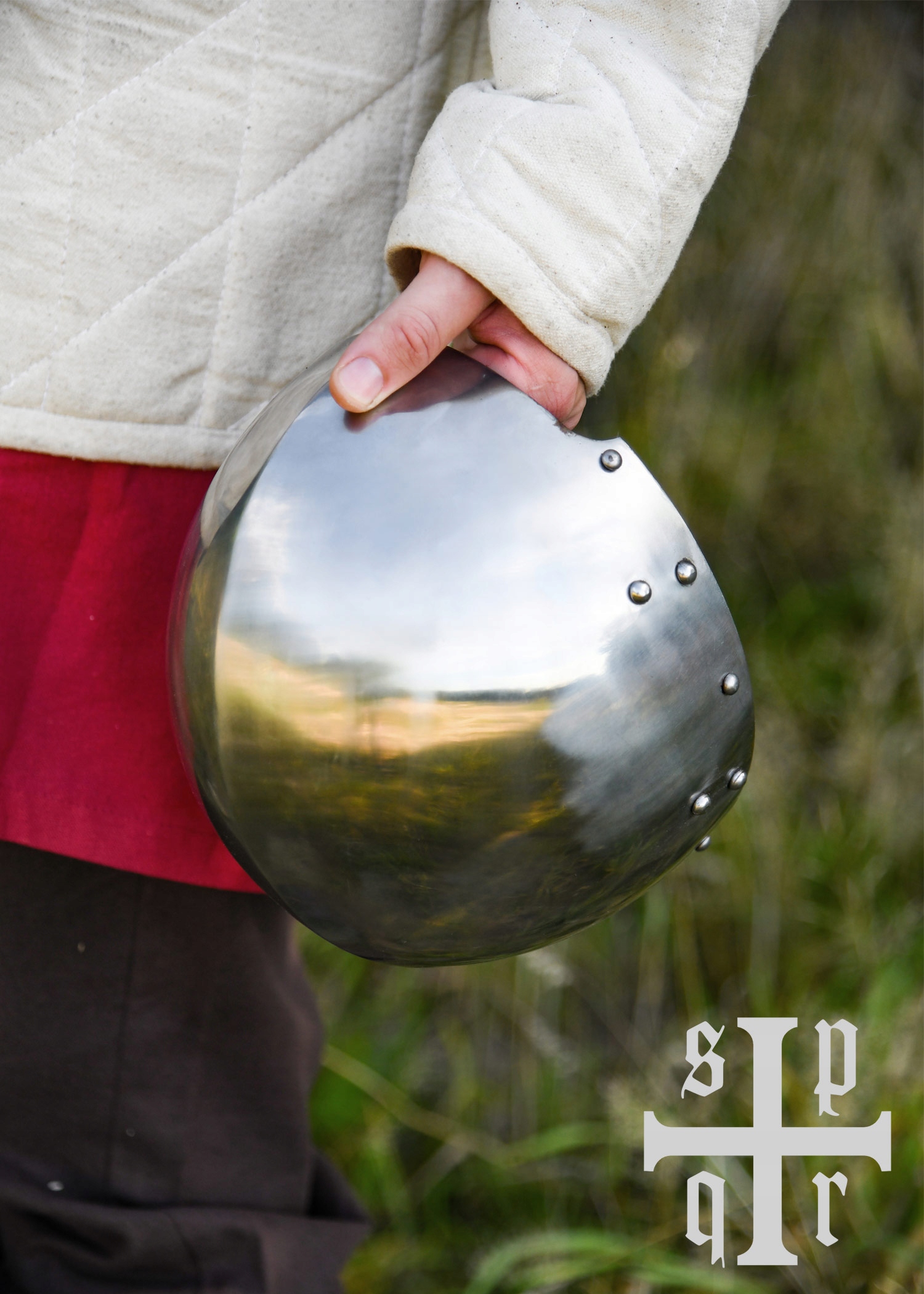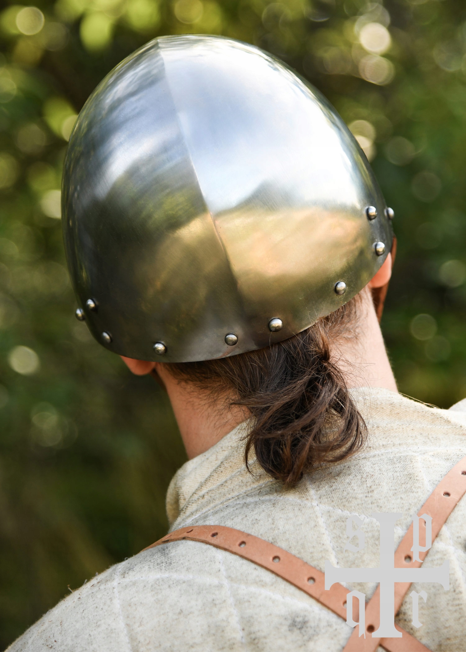 Це копія шолома, який носили в 13 столітті, виготовлена зі сталі товщиною 2 мм. Внутрішня частина цього боєздатного шолома почорніла для кращої стійкості до корозії та має регульовану шкіряну підкладку. Міцний, регульований шкіряний підборідний ремінь закривається латунною пряжкою.