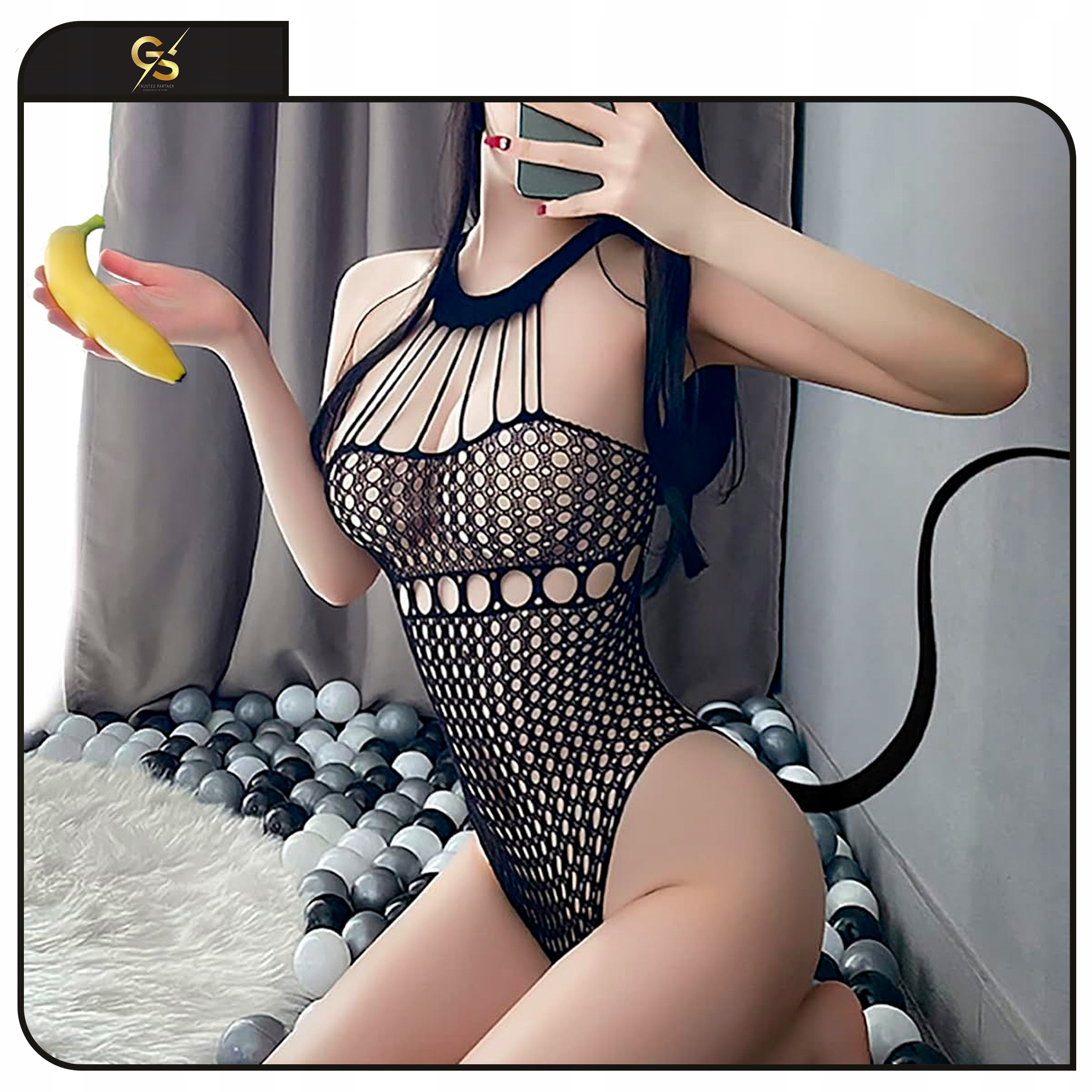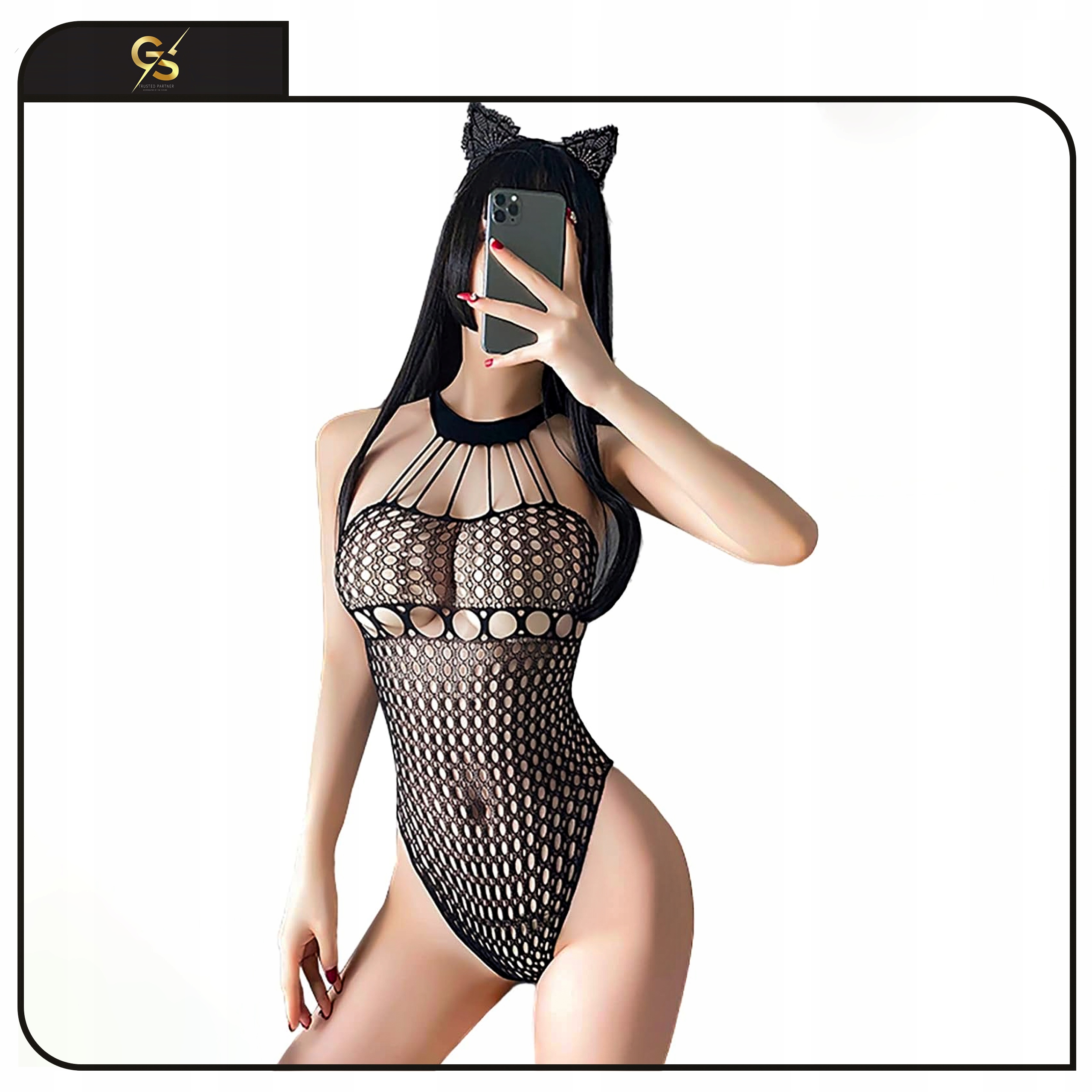 Завдяки гнучкому сітчастому тілу ідеально дотримується тіла , підкреслюючи всі жіночі переваги та маскування незначних недосконалостей. халтерна шия з декоративними смужками оптично подовжує шию і підкреслює руки, в той час як стратегічно розташовані отвори в сітці створіть інтригуючий візуальний ефект. Тіло буде ідеальним як як елемент прелюдії, так і головної привабливості вечора.