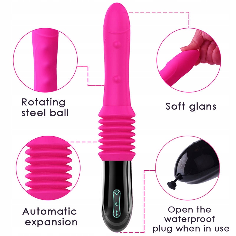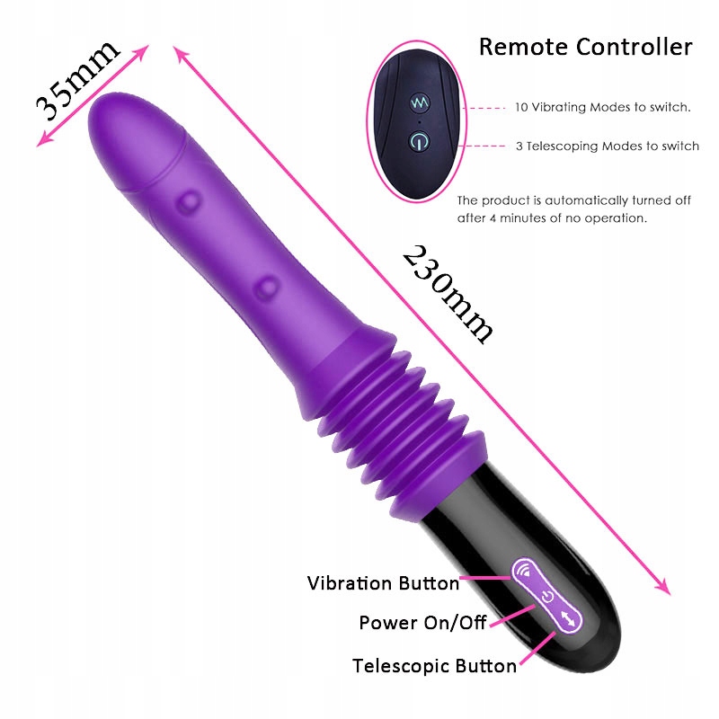 Я радий представити телескопічний фалоімітатор-вібратор з дистанційним керуванням і присоскою. Вібратор призначений для роботи на штативі з присоскою або без неї. Ручка ергономічна з пазами, що облягають руку. Ковзання відбувається на відстані приблизно 4,5 см. Крім того, фалоімітатор вібрує як класичний вібратор на дуже високій частоті, що може успішно використовуватися як масажер для клітора. Вібрації та швидкість ковзання можна легко відрегулювати відповідно до наших потреб. У комплект входить бездротовий пульт дистанційного керування, який в руках вашого партнера принесе масу задоволення. Також масажер є цінним гаджетом для тренування м'язів Кегеля, регулярна стимуляція яких значно покращує сексуальний стан жінки. Ергономічна форма пристрою була адаптована для приємного проникнення в піхву та анальний отвір. Завдяки цьому масажер ідеально стимулює найбільш чутливі точки і при цьому дозволяє пристрою залишатися на місці, не тримаючи його.