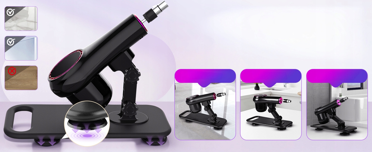 Пристрій розроблено з урахуванням безпеки тіла — виготовлено з міцного ABS-пластику, металу та TPE. Стійка основа з присосками надійно тримає машину на гладких поверхнях, а регульована ручка з ручкою дозволяє встановити робочий кут приблизно до 85°, щоб легко вибрати найбільш зручне положення.