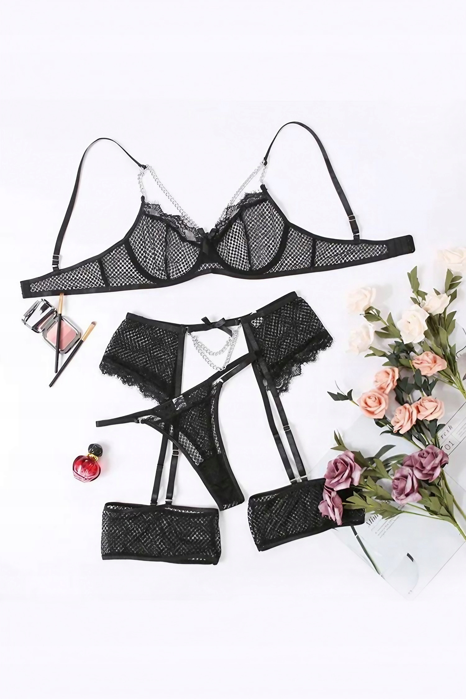 SEKSOWNY KOMPLET BIELIZNY EROTYCZNEJ BIUSTONOSZ STRINGI PODWIĄZKI ŁAŃCUCH