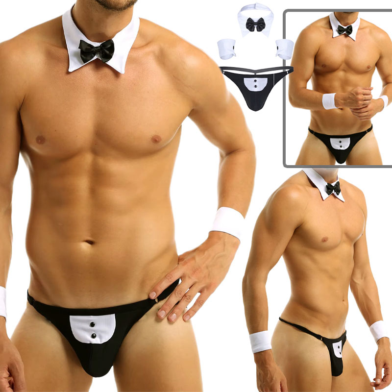 ✅Новий чоловічий смокінговий білизняний костюм офіціанта, включає ремінці зі стрингами, одну пару браслетів і шийну деталь.