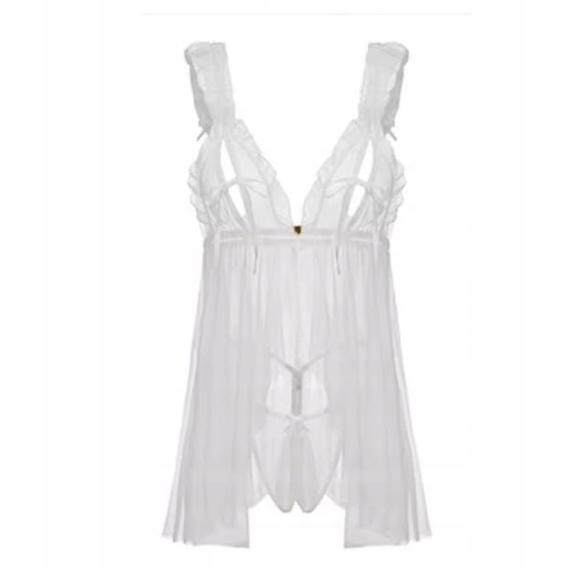 Ніжна та чуттєва дитяча сорочка з прозорого матеріалу, яка підкреслює жіночність і надає вечорам інтимний характер. Оборки на лямках і зав'язки спереду додають шарму та елегантності. До комплекту входять стрінги в тон, що створює ідеальний комплект. Ідеальний вибір для жінок, які цінують витончену чуттєвість і комфорт.