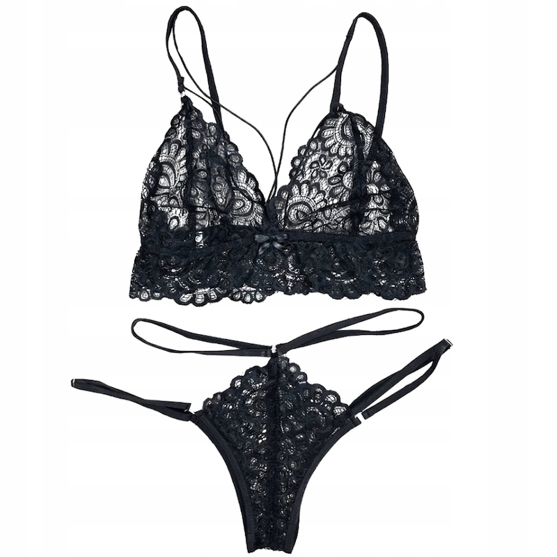 Комплект виготовлений з приємного мережива. Бюстгальтер і трусики оздоблені декоративними бретелями.