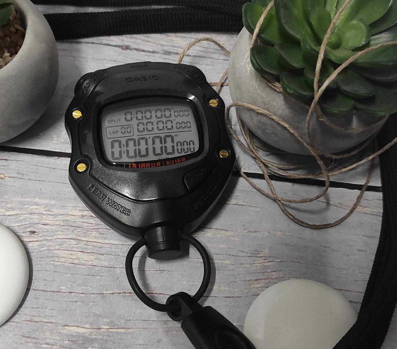Секундомір CASIO HS-80TW-1EF. Клас герметичності 50М. Пластиковий корпус. Пам'ять 2 x 100 проміжних часів (LAP). Таймер інтервалів з автоповтором. Футбольний секундомір. Лічильники. 12 сигналізаторів. Годинник