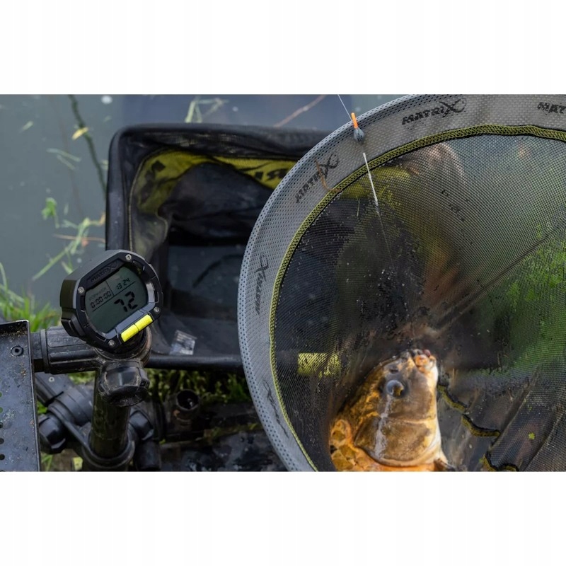 - Дисплей показує час, секундомір і вага або кількість риби