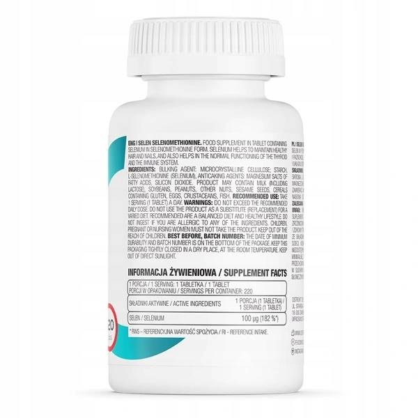OstroVit Selen - це дієтична добавка, що доповнює щоденний раціон селеном у формі селенометіоніну. Селен - це мікроелемент, який впливає на правильну роботу практично всього організму. Це допомагає захистити клітини від окислювального стресу. Селен сприяє правильній роботі щитовидної залози. Це також допомагає підтримувати здоров'я волосся та нігтів. Сприяє правильному перебігу сперматогенезу. Селен також сприяє належному функціонуванню імунної системи.