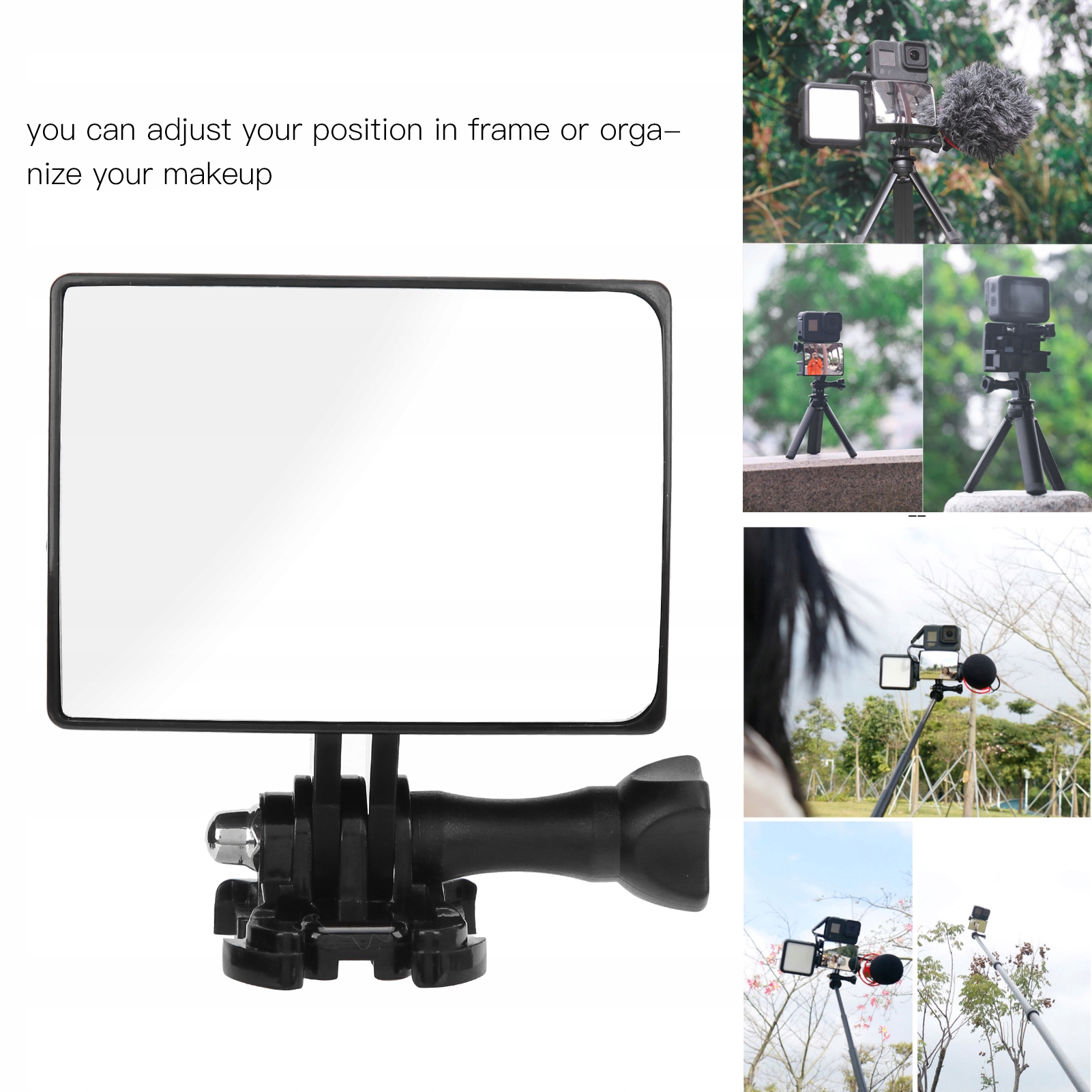 1. Дзеркала селфі з кампанією можна використовувати з камерою, яка допоможе вам взяти селфі під час активності на свіжому повітрі. Дотримуйтесь умов фотографії, щоб регулювати своє положення в кадрі в режимі реального часу або організувати макіяж. Універсальна ручка, сумісна з більшістю спортивних камер, доступних на ринку, невеликий розмір не займає місце, простий у перенесенні. Зручно для запису відео Vlog, катання на лижах та серфінгу та інших спортивних записів. За допомогою ручки холодного взуття, ручки велосипеда та велосипедної основи можна поєднувати зі світлом і мікрофоном.
