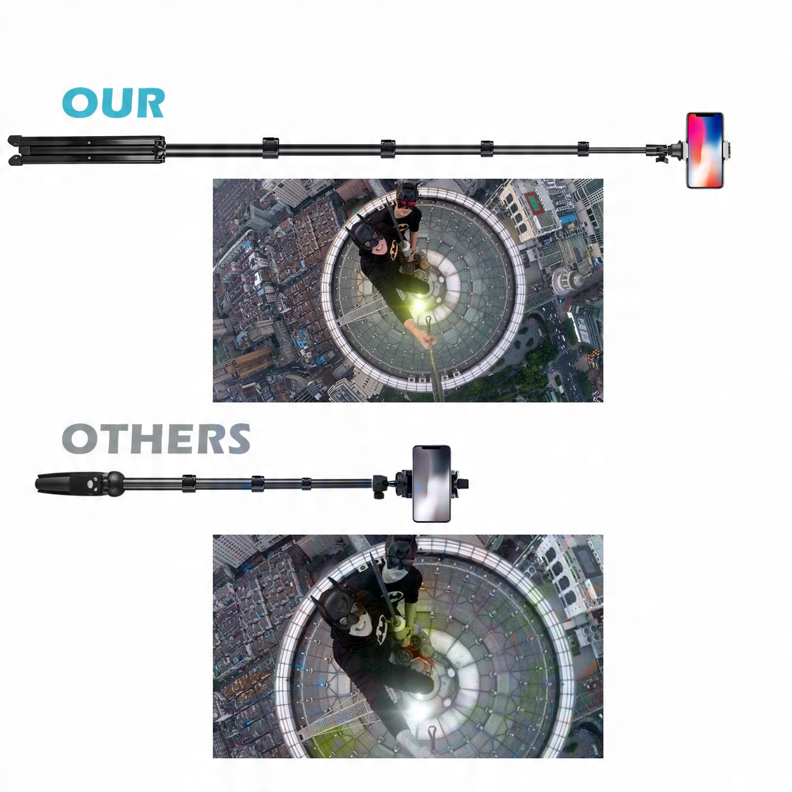 ✅ - Штатив можна легко перетворити на палицю для селфі. Якщо вам потрібен більш природний і спокійний портрет, покладіть його на підлогу та створюйте контент без використання рук за допомогою пульта дистанційного керування Bluetooth, що входить у комплект. (до 30 метрів)
