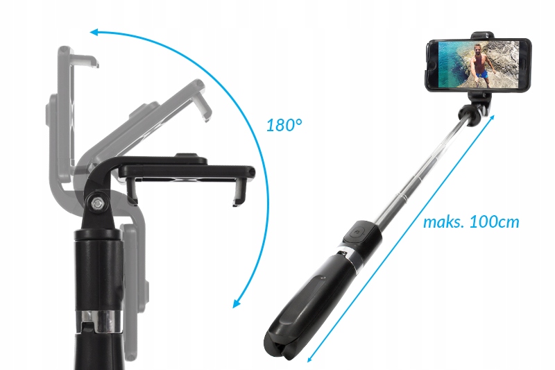 Універсальний характер пристрою складається з з’єднання Bluetooth і висувної ручки. Ручка приладу розділена на три ніжки, які в розкладеному стані створюють якісний штатив, оснащений спеціальним неслизьким торцем.