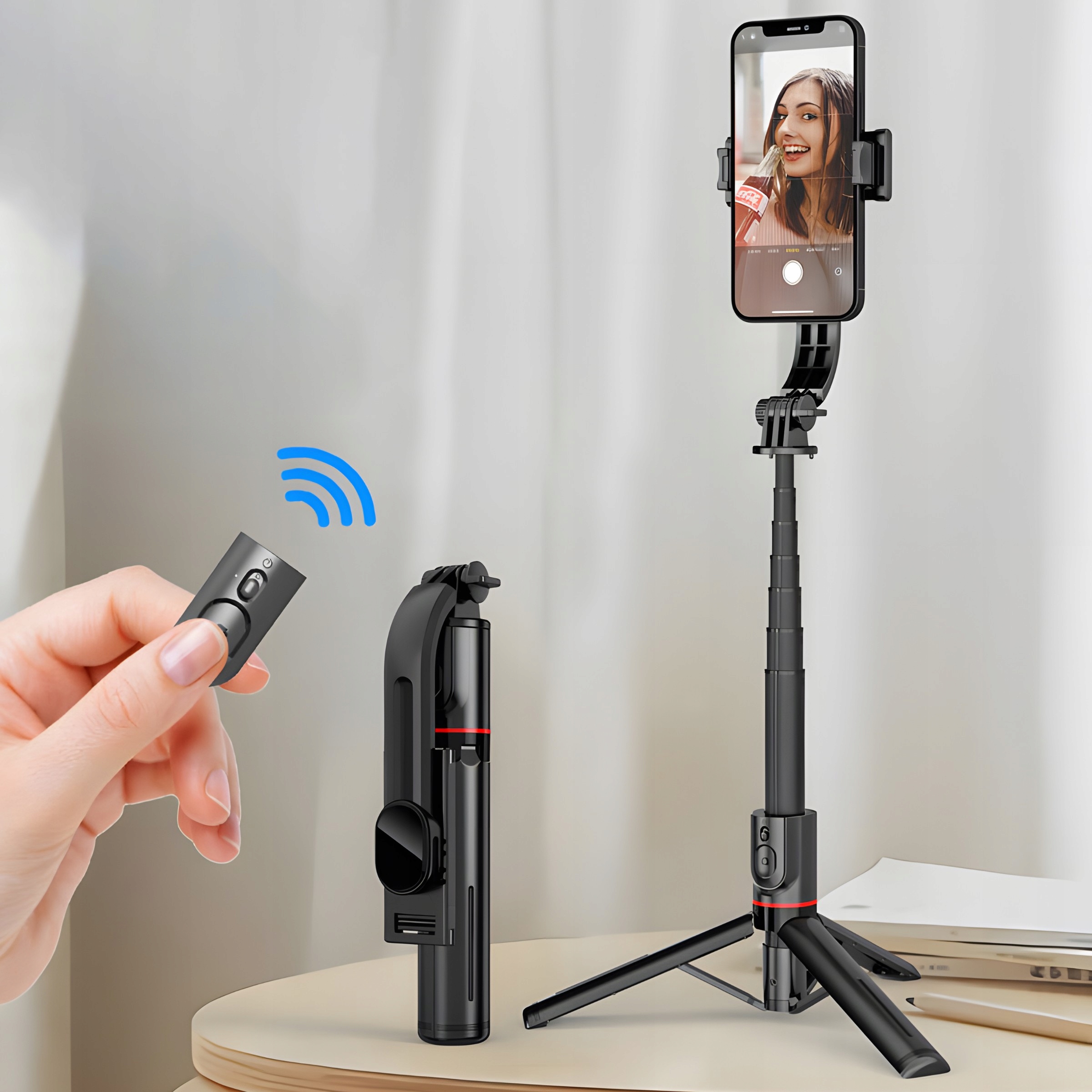 Зручний пульт дистанційного керування Bluetooth дозволяє вам дистанційно робити фотографії, не торкаючись телефону, що особливо корисно для власнихпортретів та групових фотографій. Дистанційне управління працює від замінної батареї, що забезпечує тривалий термін експлуатації пристрою та можливість швидкої заміни акумулятора, коли виникає потреба.