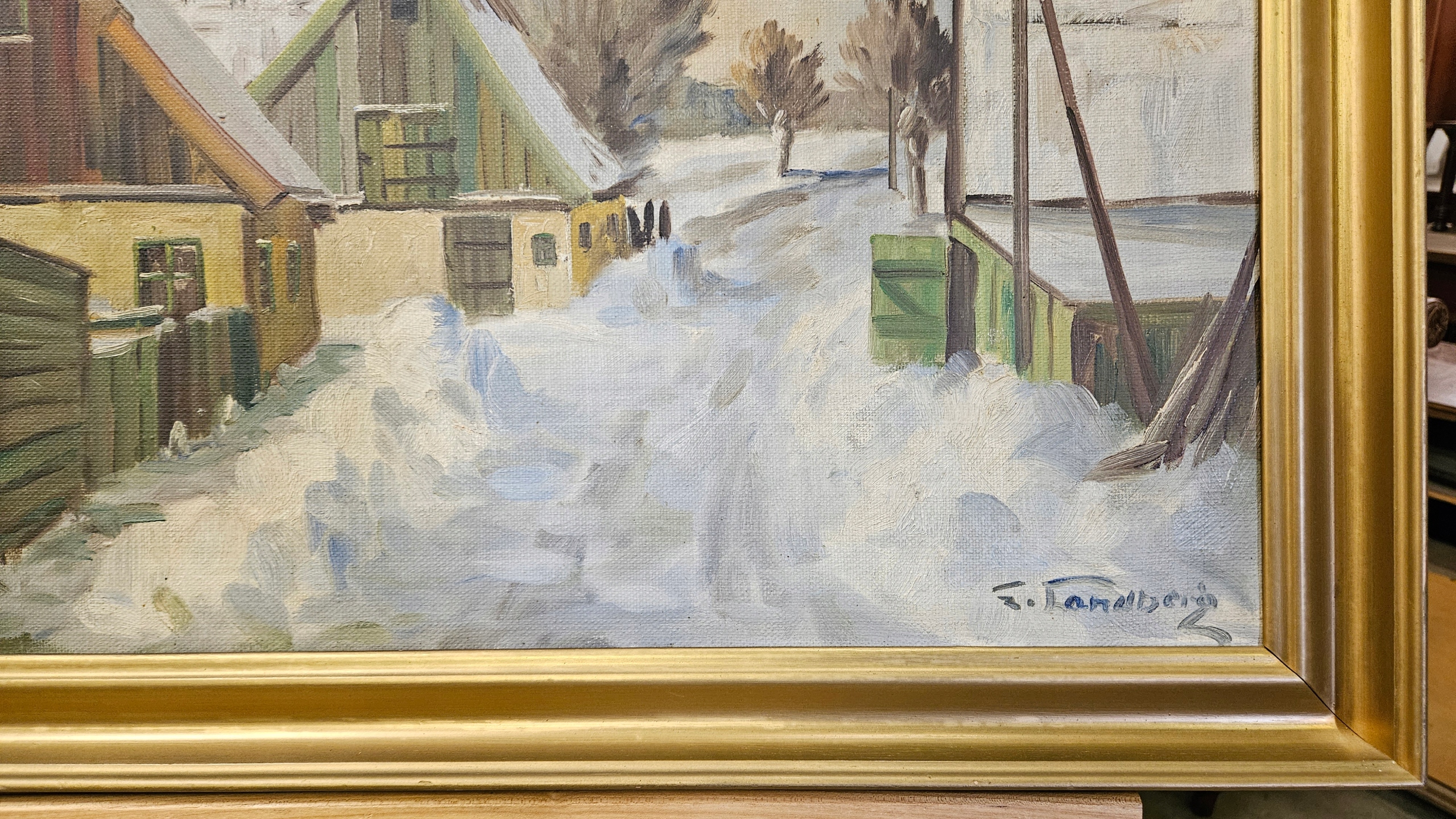 Опис: Продаж прекрасне старе підписане зображення. У роботі представлений мальовничий сільський пейзаж з будівлями взимку.