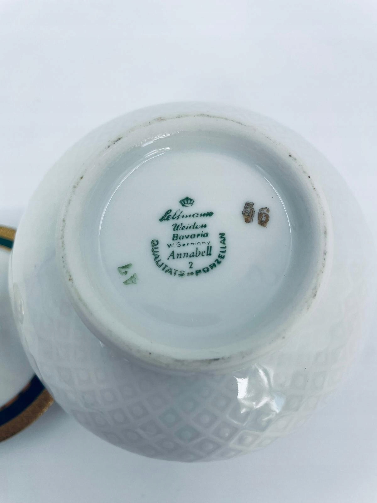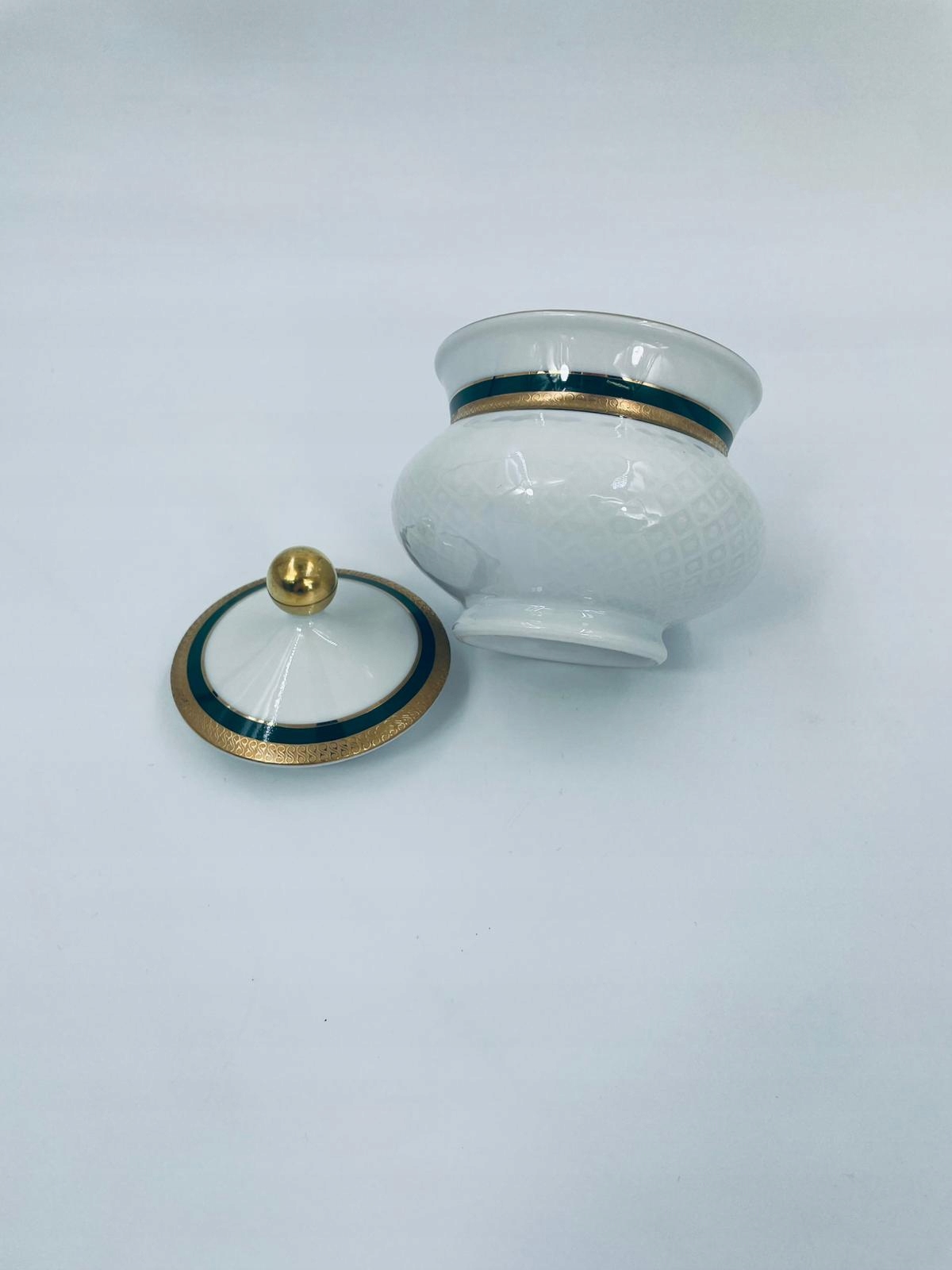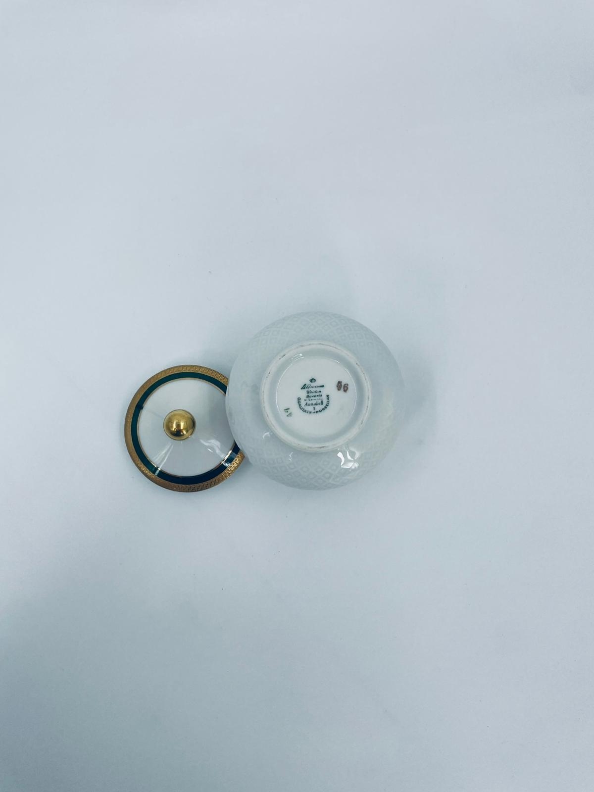 Seltmann Weiden Annabell Confectecer, виготовлений з високоякісного благородного білого порцеляна в 1954-1990 роках. Він характеризується опуклим делікатним малюнком та золотим та смарагдовим кольором, закінченим візерунком у позолоченому.