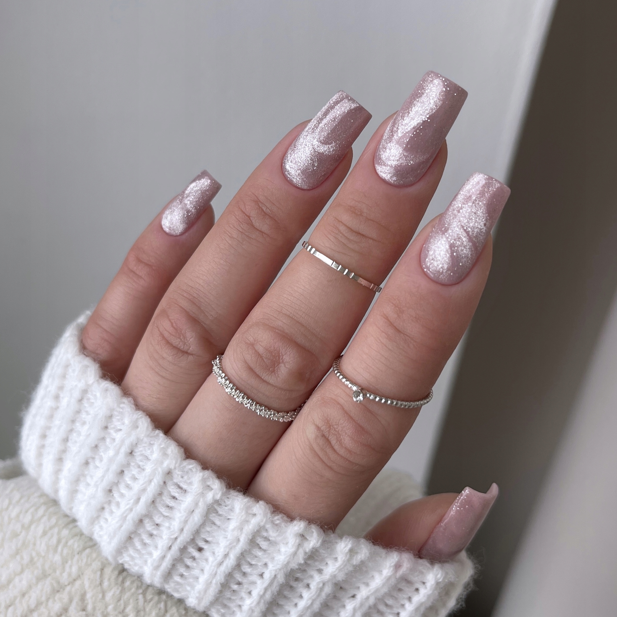 Холодний ніжно-рожевий відтінок із ніжними сріблястими частинками магнетику, які танцюють на світлі, створюючи ефект м’якої поверхні світла.