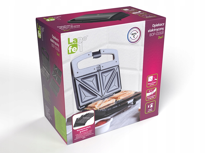 Тостер LAFE BOP-106B – це фактично три пристрої в одному – легко замінні пластини дозволяють випікати різні прості страви. Залежно від встановлених нагрівальних плит ви можете легко і швидко приготувати класичні «гарячі бутерброди», солодкі вафлі або страви на грилі.