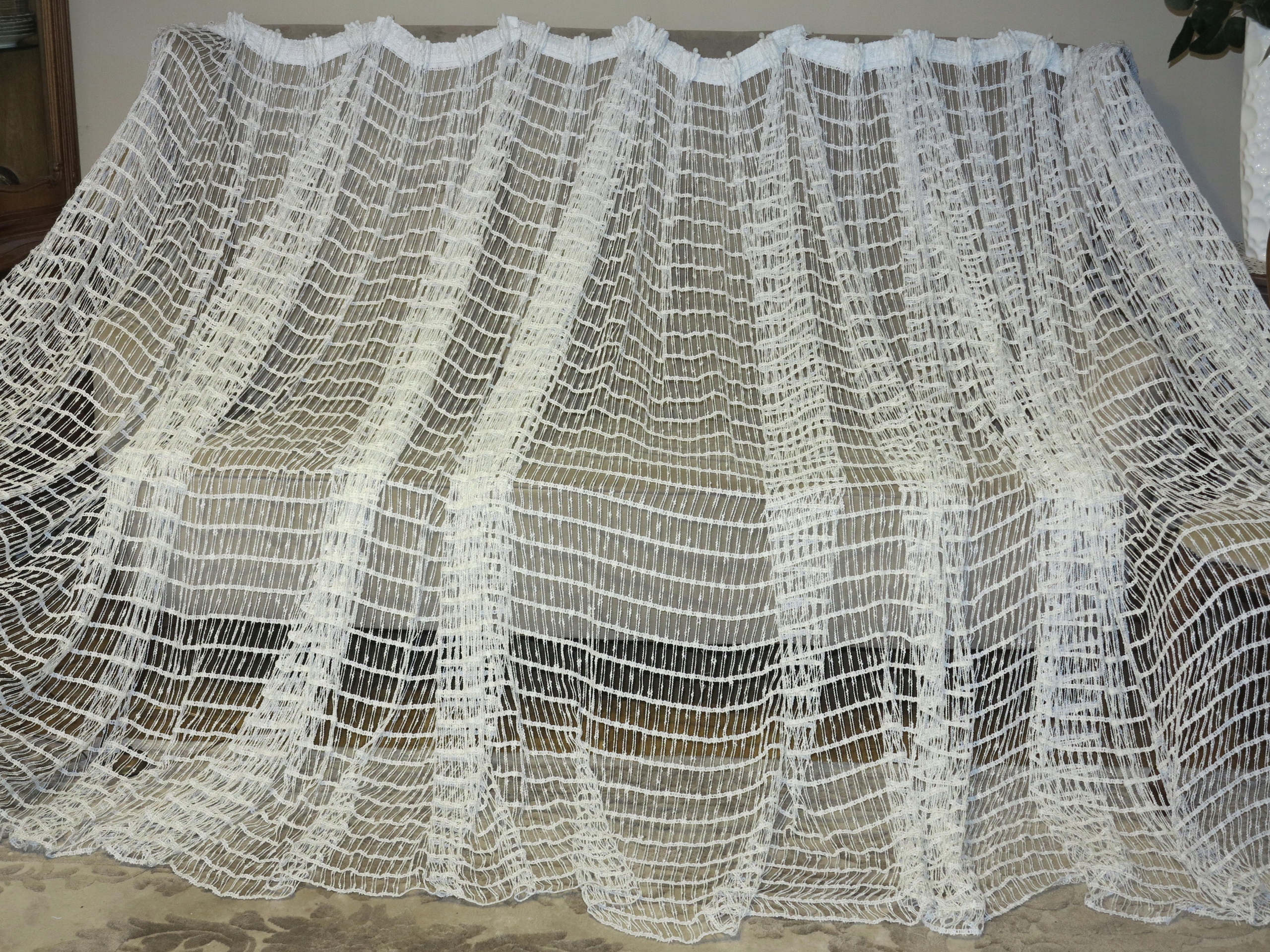 ідеально для використання. Використовується в дуже хорошому стані (в сітці може бути відсутність однієї нитки, вона повністю невидима за кількістю штор, і включається в ціну)Розміри завіси: ширина: знизу 725 см, ширина вгору вгору: 280cm