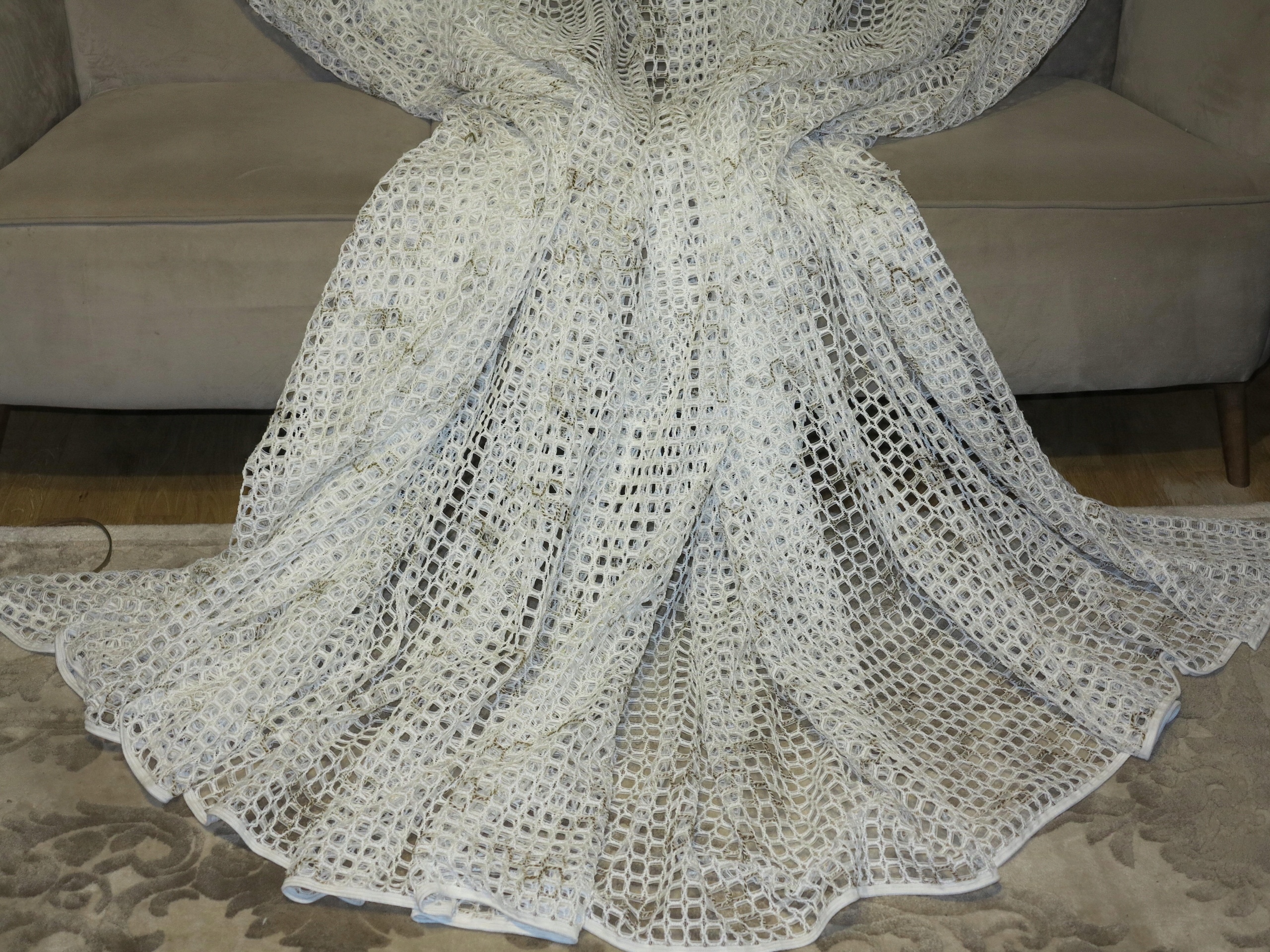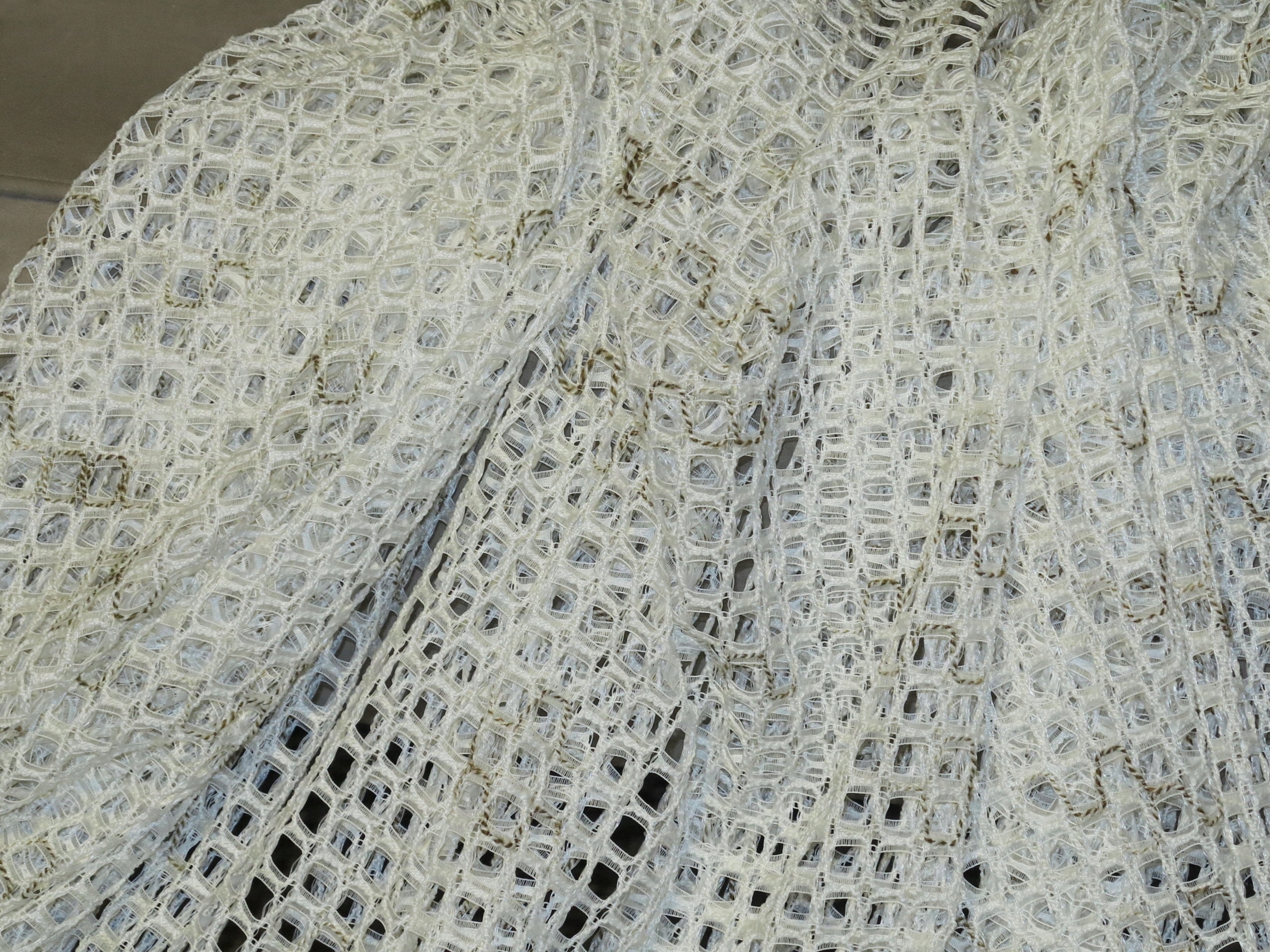 Волейбольне мереживо, дуже зручне для використання. Завіса має пришитну рухову стрічку. Завіса має розміри: ширина 558 см, висота 115 см. Використовувана завіса, але в супер хорошому стані. Я рекомендую, це виглядає красиво і дуже оригінально. Я чесно рекомендую.