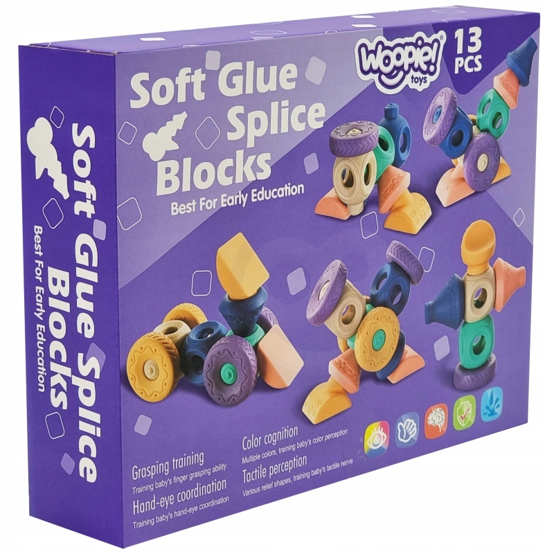 Сенсорні блоки головоломки WOOPIE зацікавлять кожного малюка. Завдяки цікавим формам, кольорам і здатності видавати звуки шляхом стискання вони чудово стимулюють розвиток зорово-слухової координації і дотику. Блоки мають опуклі форми з фактурами/візерунками і геометричними фігурами. Крім того, блоки можна з’єднувати разом і будувати різні структури, напр. гонщик. Блоки м'які та приємні на дотик. Завдяки своїй структурі вони також ідеально підходять як прорізувач. Продукт у красивих приглушених кольорах призначений для дітей від 6 місяців.