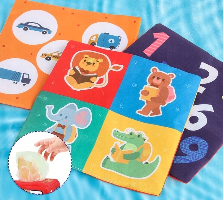 У коробці ваша дитина буде рада виявити тканинні серветки, які можна витягнути та покласти назад. Проста, але захоплююча механіка допомагає розвивати моторику, координацію рук і очей і здатність розуміти причинно-наслідкові зв’язки.