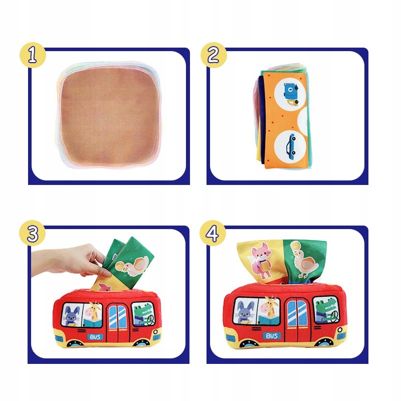 Tissue Box — це іграшка, яка поєднує інновації та освіту в одному. Коробка виготовлена з м'яких і безпечних матеріалів, приємних на дотик і абсолютно безпечних для ніжної шкіри дитини. Його яскраві кольори та різноманітні текстури спонукатимуть малюка досліджувати.