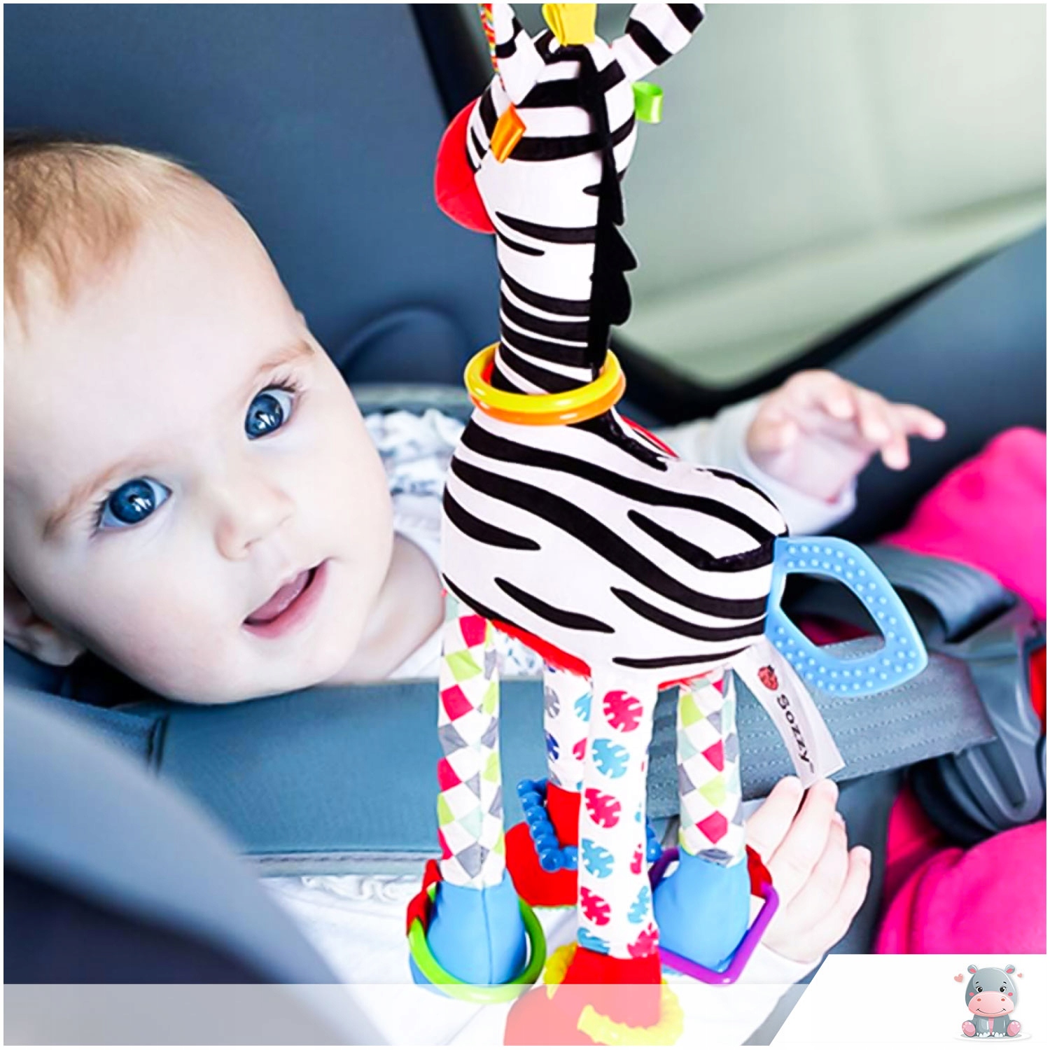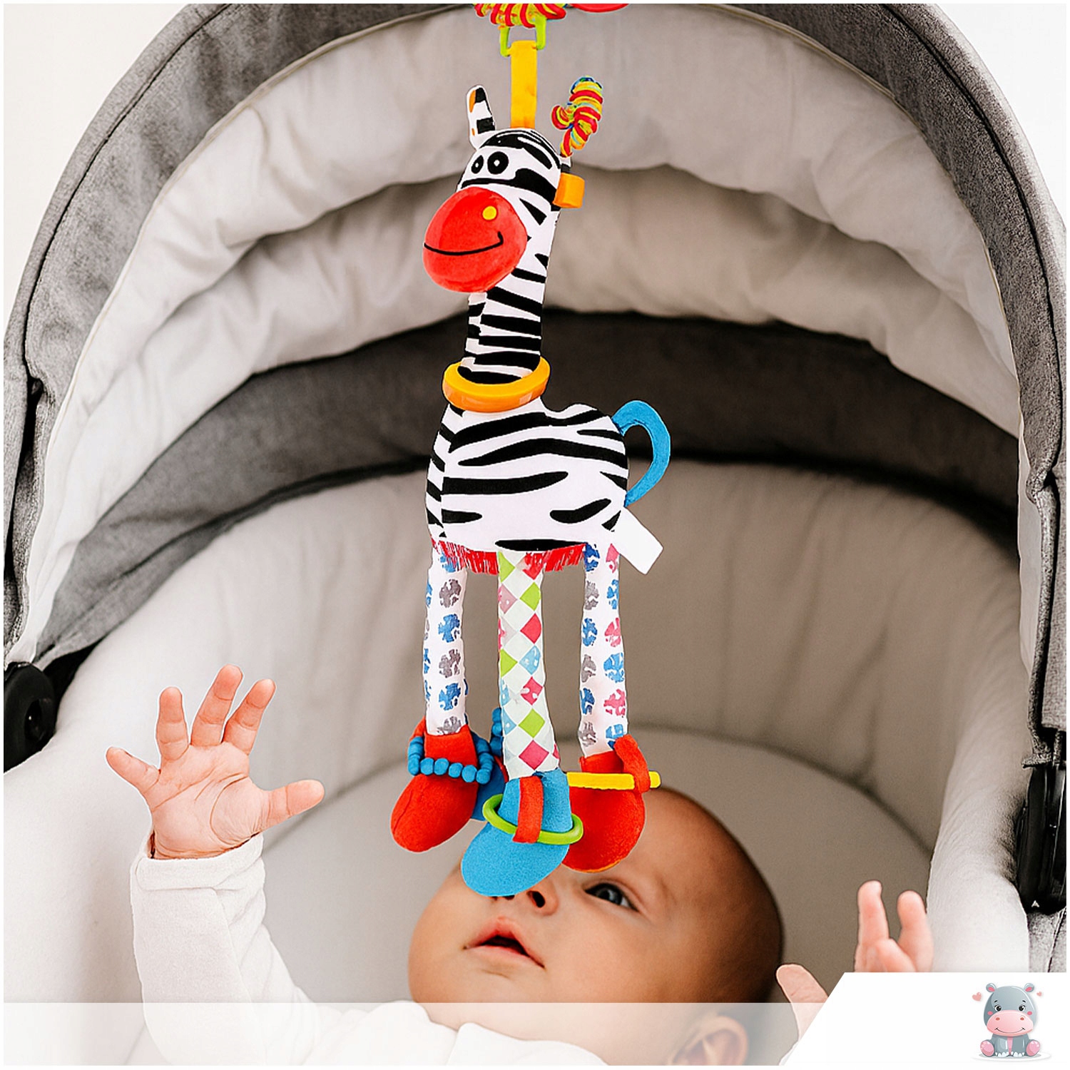 - барвисті ручки та зуби : ноги зебри закінчені додатковими елементами для тягання та кусання - виготовлених із безпечного матеріалу, допомагають під час прорізування зубів та розвивають зчеплення.
