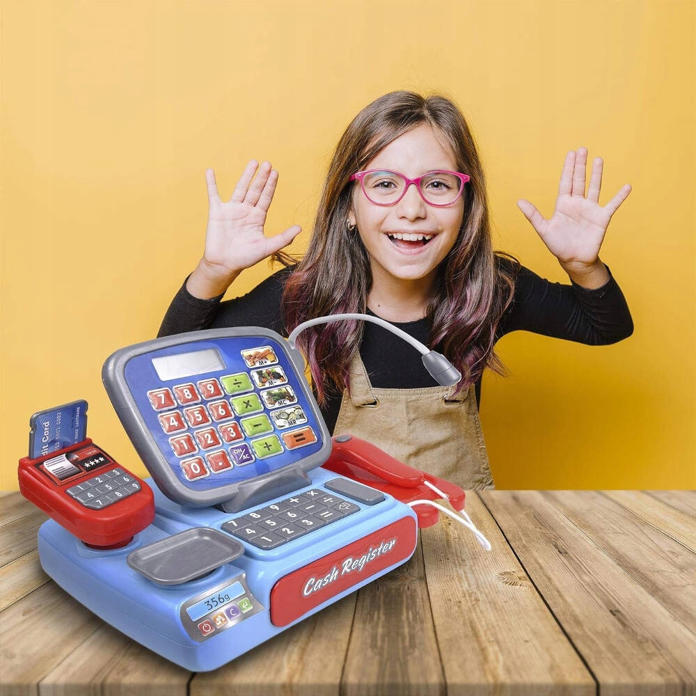 можна вільно обертати вперед і назад, що зручно для маленьких клієнтів, щоб провести карткою, і коли ви натискаєте кнопку, буде хропіння. Оснащений імітаційною платформою для зважування, ви можете розмістити на ній безкоштовні аксесуари, щоб зважити їх! Цифровий калькулятор, ви можете вивчати математику під час гри