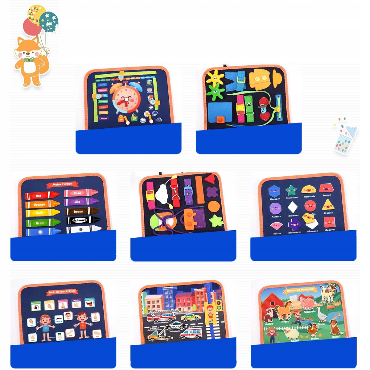 - 🎉8 СТОРІНОК, НЕСКІНЧЕННА РОЗВАГА - наша ігрова дошка має 8 сторінок, на яких ваша дитина годинами розважатиметься. Ця ігрова дошка Монтессорі була розроблена з різними рівнями складності, щоб бути складною, але не надмірною, і щоб зацікавити малюків. До них входять пряжки, блискавки, шнурки, ремені, кнопки, годинники, календарі, фігури, цифри, алфавіти на липучках, пазли про тварин тощо (німецьке видання).