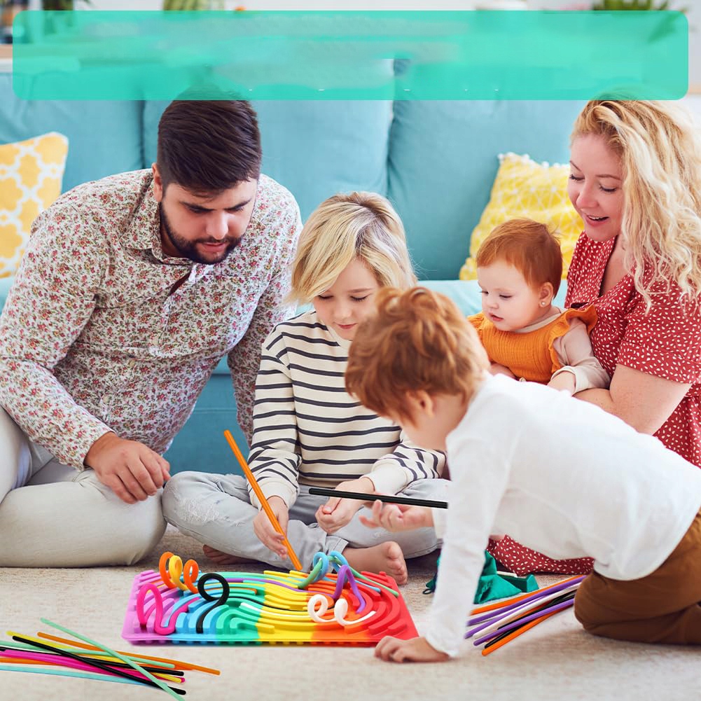 【Безпечна та портативна】Ця сенсорна іграшка-дошка виготовлена з високоякісного силіконового матеріалу, нетоксичного та без задирок, що забезпечує безпеку дітей. Набір містить силіконову дошку, 11 різнокольорових силіконових мотузок (довжина: 185 мм) і портативну сумку, щоб ви могли грати з нею будь-коли та будь-де або ділитися нею з друзями. Ця іграшка для зняття стресу легко збирається та розбирається, тому вона ідеальна для людей будь-якого віку.