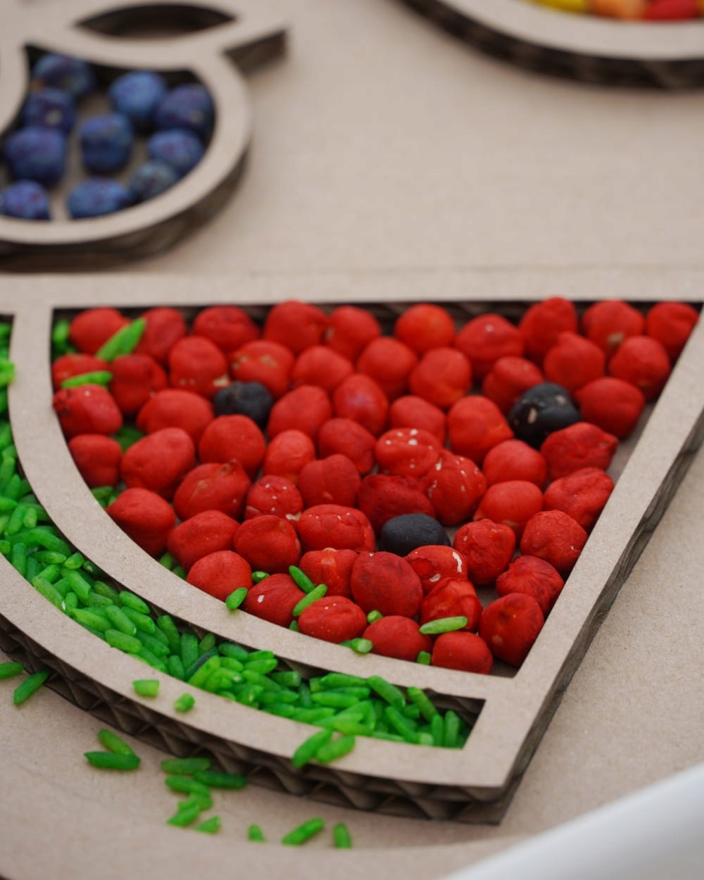 Набір складається з картонного лотка з фруктами, однієї упаковки кольорового зеленого рису 200 г і однієї упаковки кольорового нуту червоного, жовтого, темно-синього, помаранчевого та чорного кольорів загальною вагою 250 г.