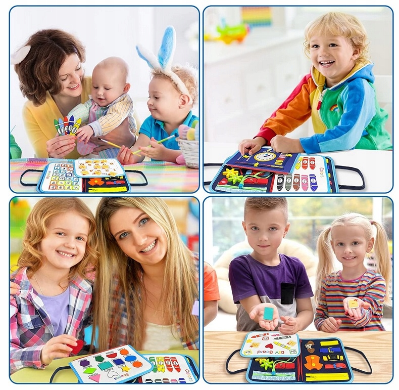 20 моторних іграшок. Будь то блискавки, ґудзики, ремені, взуття, застібки, кнопки чи застібки, все, що вам потрібно, є тут. Є також цифри від 1 до 10, алфавіт, годинник і різні форми для вивчення.