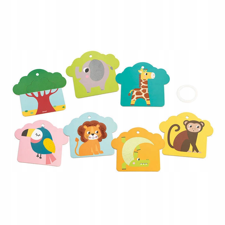 Набір сенсорних карт Savanna від французького бренду Janod. Складається з 7 елементів: 1 картка з початковим елементом (дерево) і 6 карток із тваринами, що населяють савану (мавпа, слон, лев, папуга, жираф, крокодил), чиє волосся, хутро або шкіра виготовлені з фактурних матеріалів. Дотик до різноманітних текстур імітує реальні емпіричні відчуття та розвиває дотик дітей. Це також викликає додатковий інтерес до іграшки. Картки мають форму дерева, великі, зручні, розміром - 18 х 16,1 см. Вони підвішуються на кільце, тому їх зручно брати з собою на прогулянку або в подорож, і не легко втратити. Розкріпивши та знявши їх із кільця, їх можна поставити на підлогу або повісити в дитячій кімнаті.