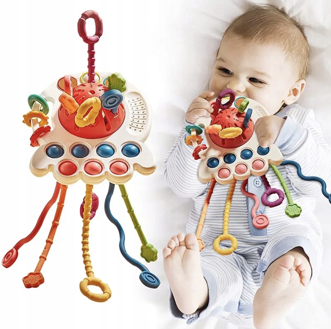 - БАГАТОФУНКЦІОНАЛЬНА СЕНСОРНА ІГРАШКА - іграшку можна успішно використовувати як прорізувач, а також як предмет для тренування маленьких ручок. Багато кнопок, які потрібно натиснути, шнурки з різними наконечниками та різний ступінь складності витягування роблять предмет приємним протягом довгих годин.
