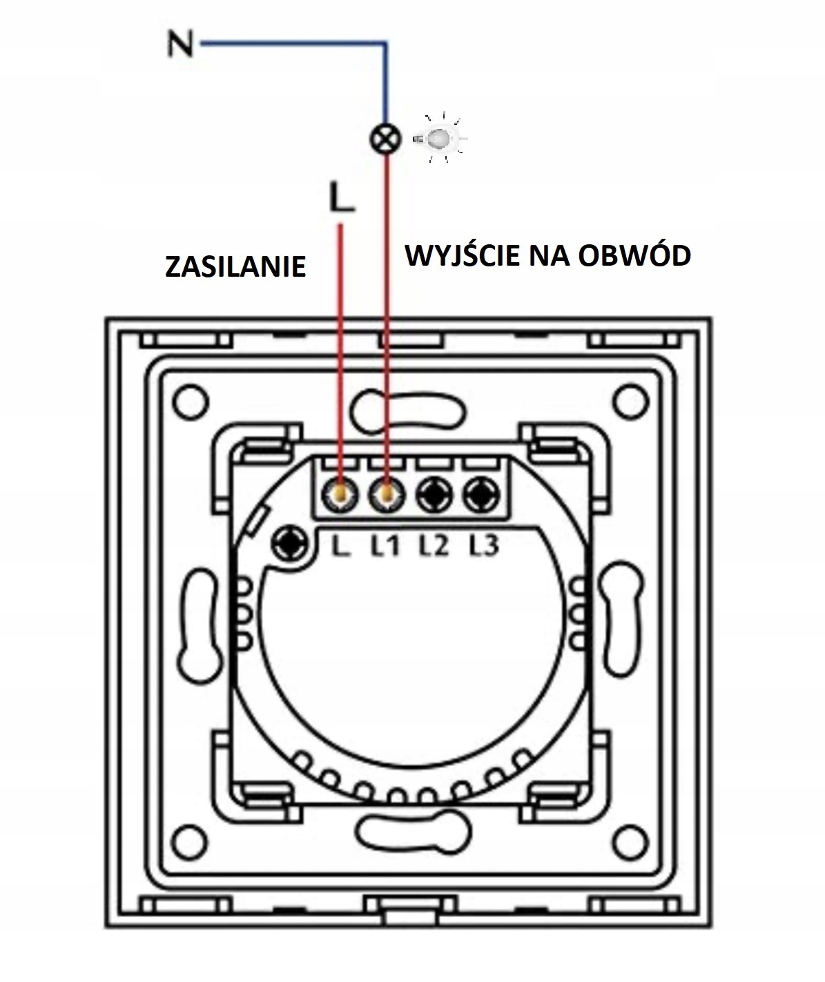 Дроти вимикача підключаються як у стандартних вимикачів. Як L ми підключаємо кабель струму до джерела живлення, а як L1 ми підключаємо вихідний кабель до ланцюга (приймач - лампа, світло тощо)