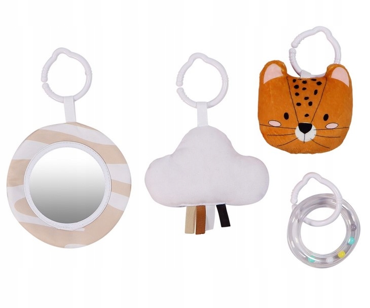 Ігровий килимок має дві дуги з чотирма прикріпленими іграшками. Брязкальце, писклява іграшка, плюшева м’яка іграшка та дзеркальце займуть вашу дитину. Додатково ігровий килимок оснащений пищалкою і бірками.