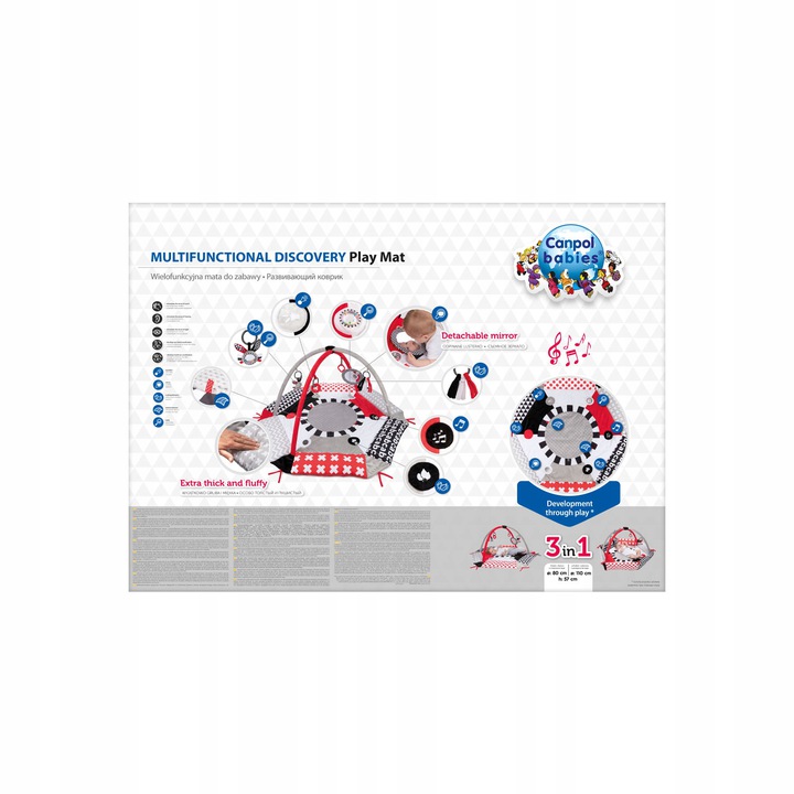 Укомплектований 5 іграшками: брязкальця, прорізувачі, дзеркала. Додатковою привабливістю є велике знімне дзеркало, яке можна прикріпити будь-де. Іграшки з іграшкових брусків можна від'єднати і дати дитині пограти. Килимок сумісний з іншими іграшками з колекції SENSORY TOYS, наприклад, з підвіскою для коляски, яку можна легко закріпити на штангах.