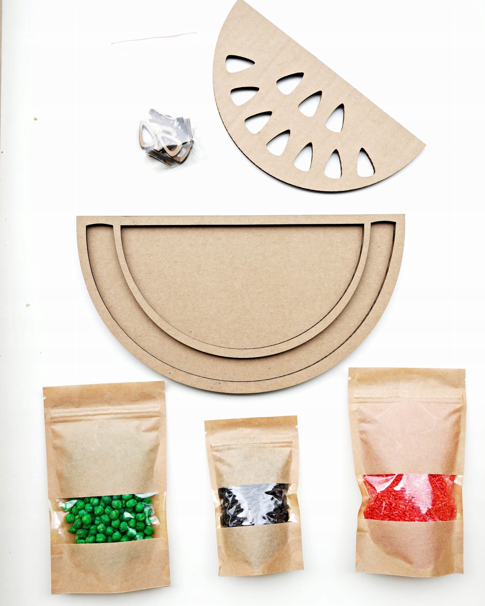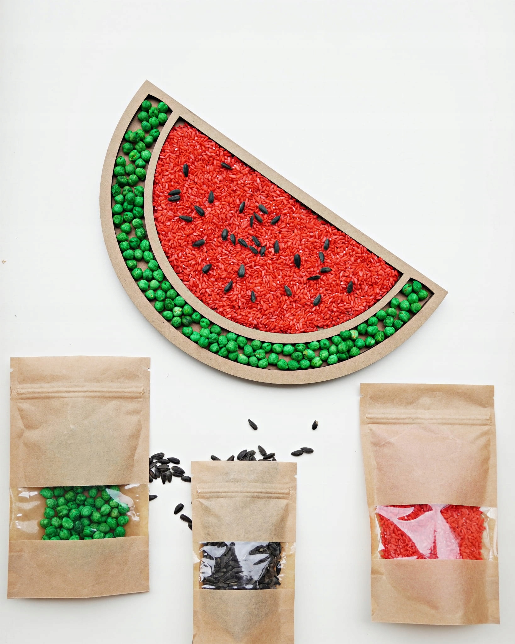 Набір складається з картонної моделі кавуна та однієї упаковки фарбованого рису, однієї упаковки кольорового нута та однієї упаковки чорних насіння соняшнику. Набір містить 100 г насіння червоного рису та 100 г зеленого нута та 50 г насіння соняшнику. Насіння пофарбовані в безпечні харчові барвники.