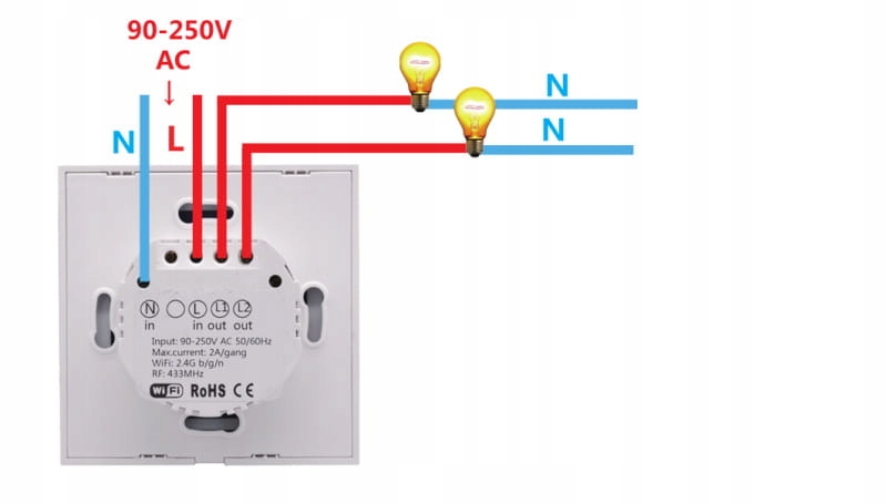 Для роботи комутатора необхідно підключити дві лінії N і L 230В. Якщо у вас немає такої установки, ми також пропонуємо вимикачі, які працюють без додаткової лінії живлення.