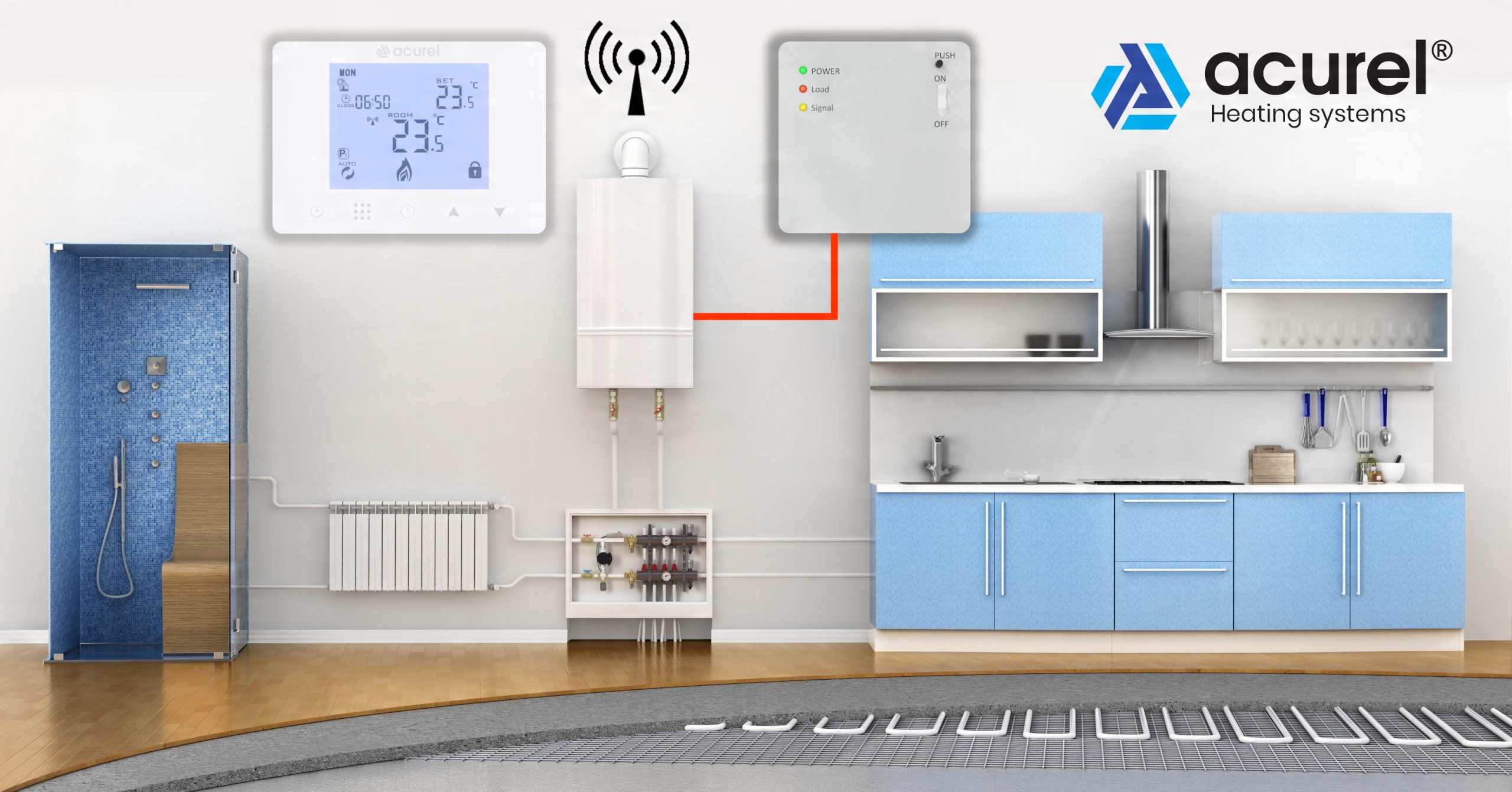 На відміну від звичайних домашніх термостатів, термостатична система Acurel HY09RF (AD145) має окремий блок керування (передавач), підключений до бездротової мережі. і блок комутації (приймач). Блок комутації використовується для підключення та перемикання печі/котла, а портативний блок керування використовується для керування та встановлення температури.