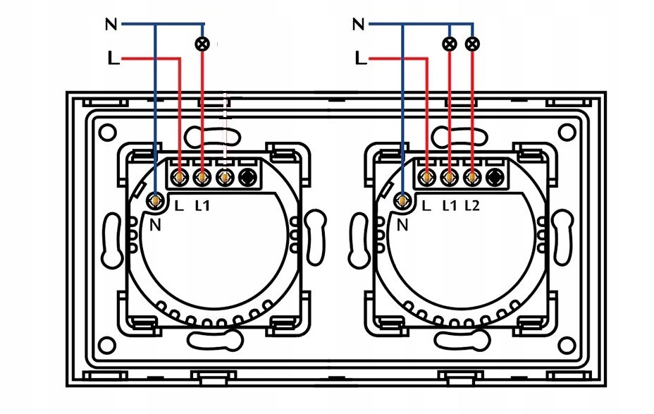 Для належної та безпечної роботи комутатора його потрібно підключити за допомогою кабелю L (живлення 230 В) і кабелю N (вхід нейтралі). У першому модулі комутатора підключаємо L - живлення і вихід L1 і L2, а в другому модулі L - живлення і вихід L1.