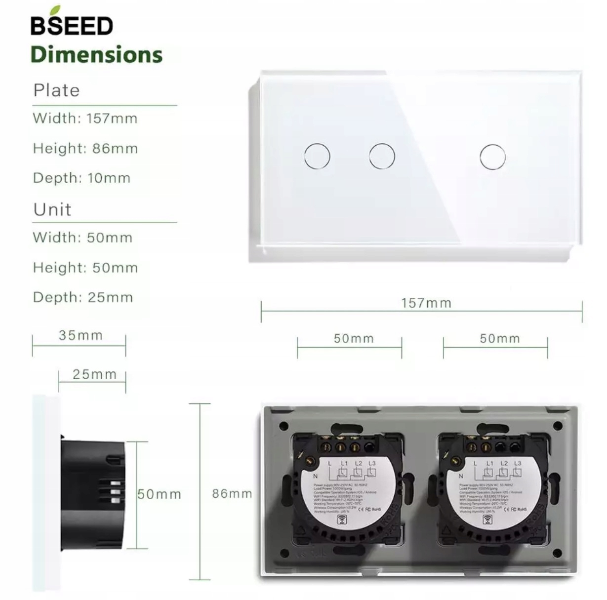 Високоякісний продукт від відомої компанії BSEED. Передня панель вся біла. Металевий каркас з'єднує всі елементи разом, що підтверджує якість використаних елементів конструкції вимикача.