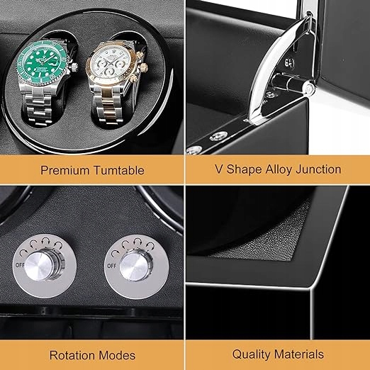 Вишуканий дизайн: елегантний , натуральний дизайн ручної роботи, високоякісний дерев’яний футляр з розкішним фортепіанним лаком, інтер’єр із надм’якою та гнучкою подушкою з поліуретану. Сумісний з усіма розмірами годинників різних марок. Надзвичайно тихий: заводчик годинників Sepano з надтихим японським двигуном Mabuchi, шум до 5 дБ і не заважає спати чи працювати. Простий у використанні: 3 напрямки (за годинниковою стрілкою, проти годинникової стрілки, обидва) і 5 режимів обертання, ви можете вибрати відповідні режими для своїх улюблених годинників і зробити так, щоб вони працювали точніше. Велика місткість: пристрій для заводу годинників Sepano може заводити 4 годинники одночасно. Це справді чудовий вибір для колекціонерів годинників. З годинниковим ротором Sepano ви можете легко зібрати всі свої висококласні годинники. Подвійне джерело живлення: пристрій для заводу годинника Sepano живиться від адаптера змінного струму 100–240 В або батареї 2*1,5 В (не входить у комплект).