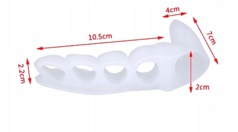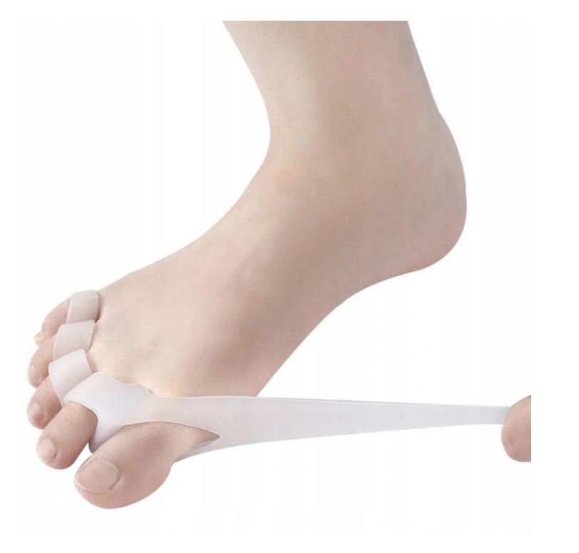 Виготовлений з м'якого та гнучкого силікону. Вони допомагають випрямити криві пальці. Роздільники мають п'ять отворів для пальців, тому добре сидять на нозі. Вони дозволяють одночасно впливати на п'ять пальців ніг, що робить процес корекції положення пальців ніг швидше і з кращим ефектом. Чудове рішення для перекривання пальців ніг.