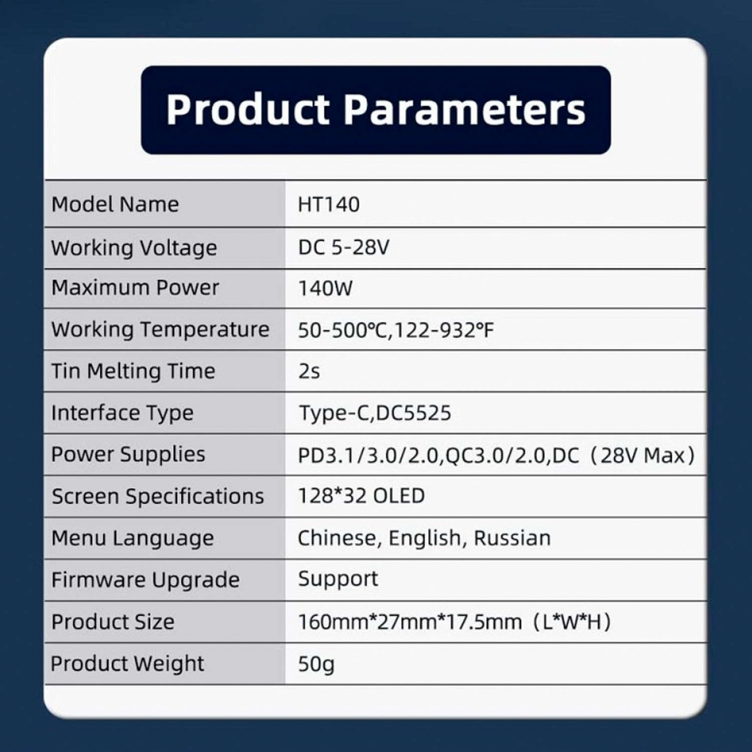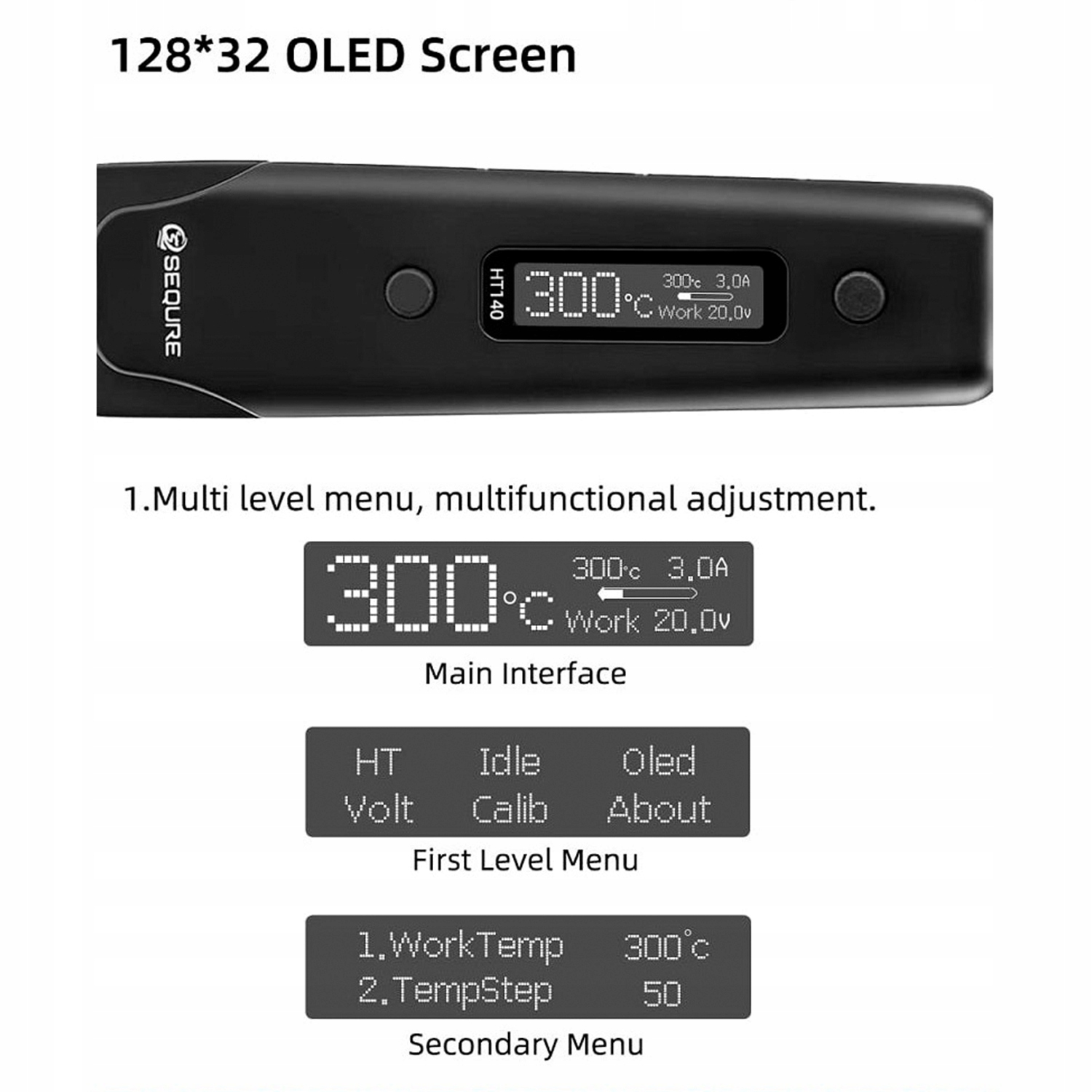 - Екран: OLED -дисплей 128*32 з регулюванням яскравості та орієнтації. Меню підтримує багато мов, включаючи китайську, англійську та російську. Користувачі також можуть переключити температурні одиниці між ℃ та ℉.