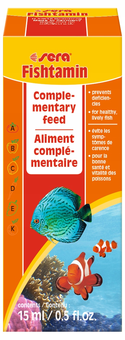 sera Fishtamin — це додатковий корм у формі ретельно виготовленого емульгованого мультивітамінного концентрату для всіх прісноводних і морських риб.