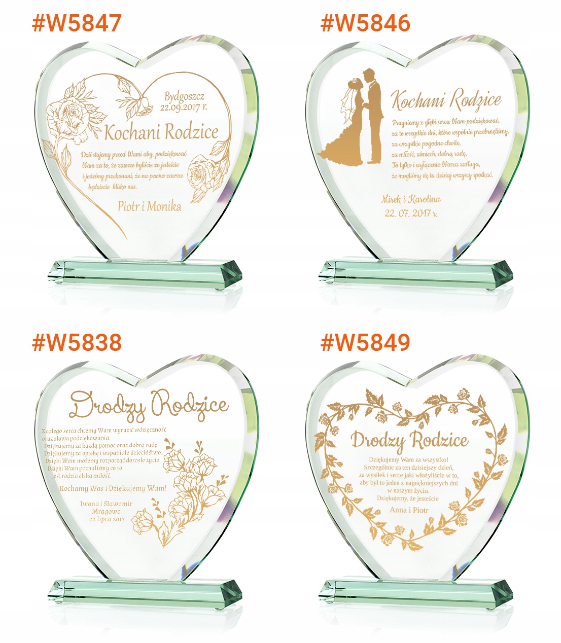 Елегантна статуетка у формі серця з вигравіруваною або друкованою присвятою. Покриваємо гравіювання золотою фарбою, це чудова ідея, щоб подякувати батькам. Висловіть свою вдячність і подаруйте їм красиву статуетку з гравіюванням/друком побажань або особистою присвятою. Золоте гравіювання або барвистий принт ідеально впишеться у весільну атмосферу, тому подарунок буде унікальним. Скляне серце виготовлено з товстого скла, що робить його міцним і міцним. Упакований в елегантний корпус сапфірового кольору, він підкреслить ефект майстерності та золотого покриття або кольорового друку.