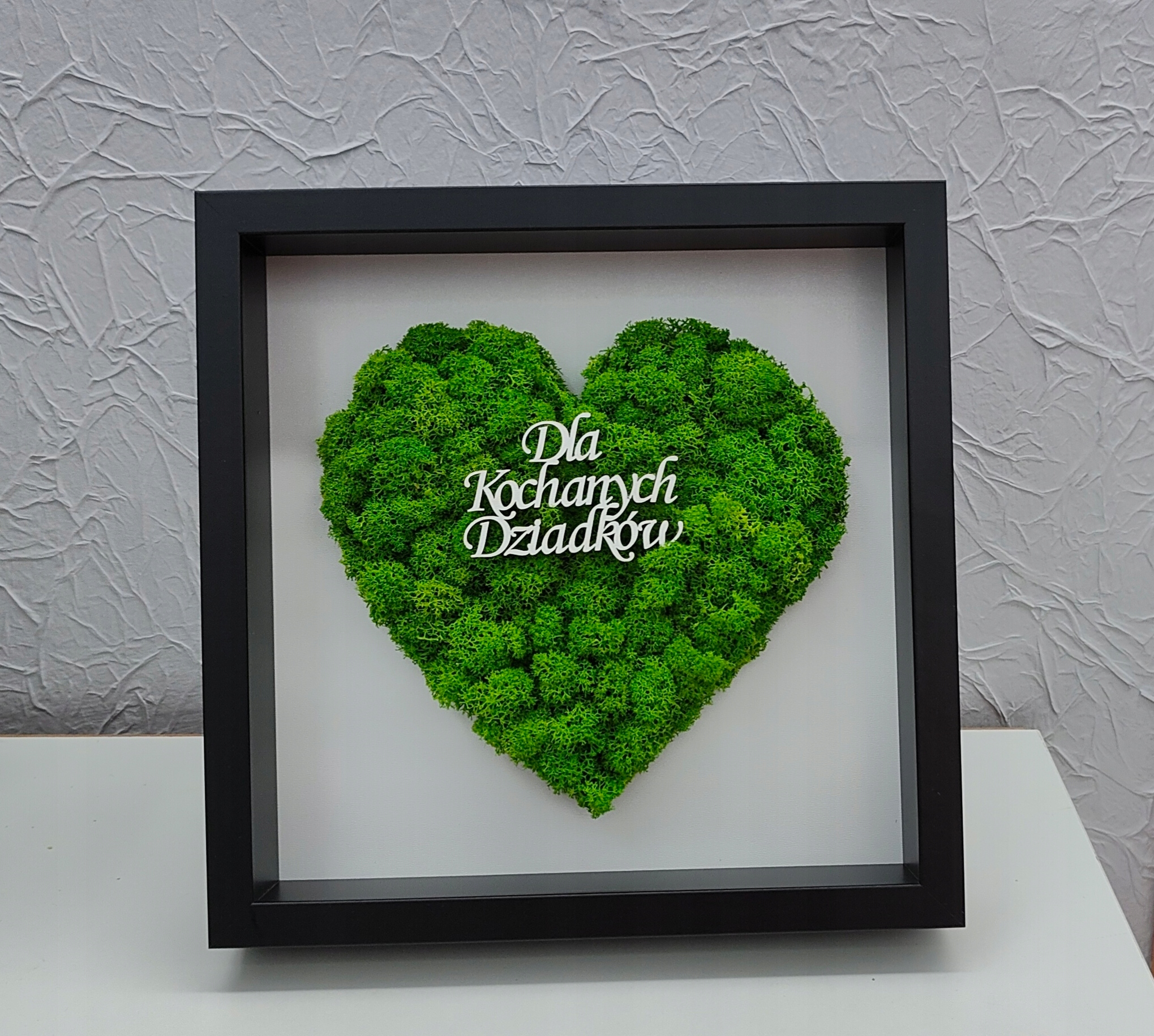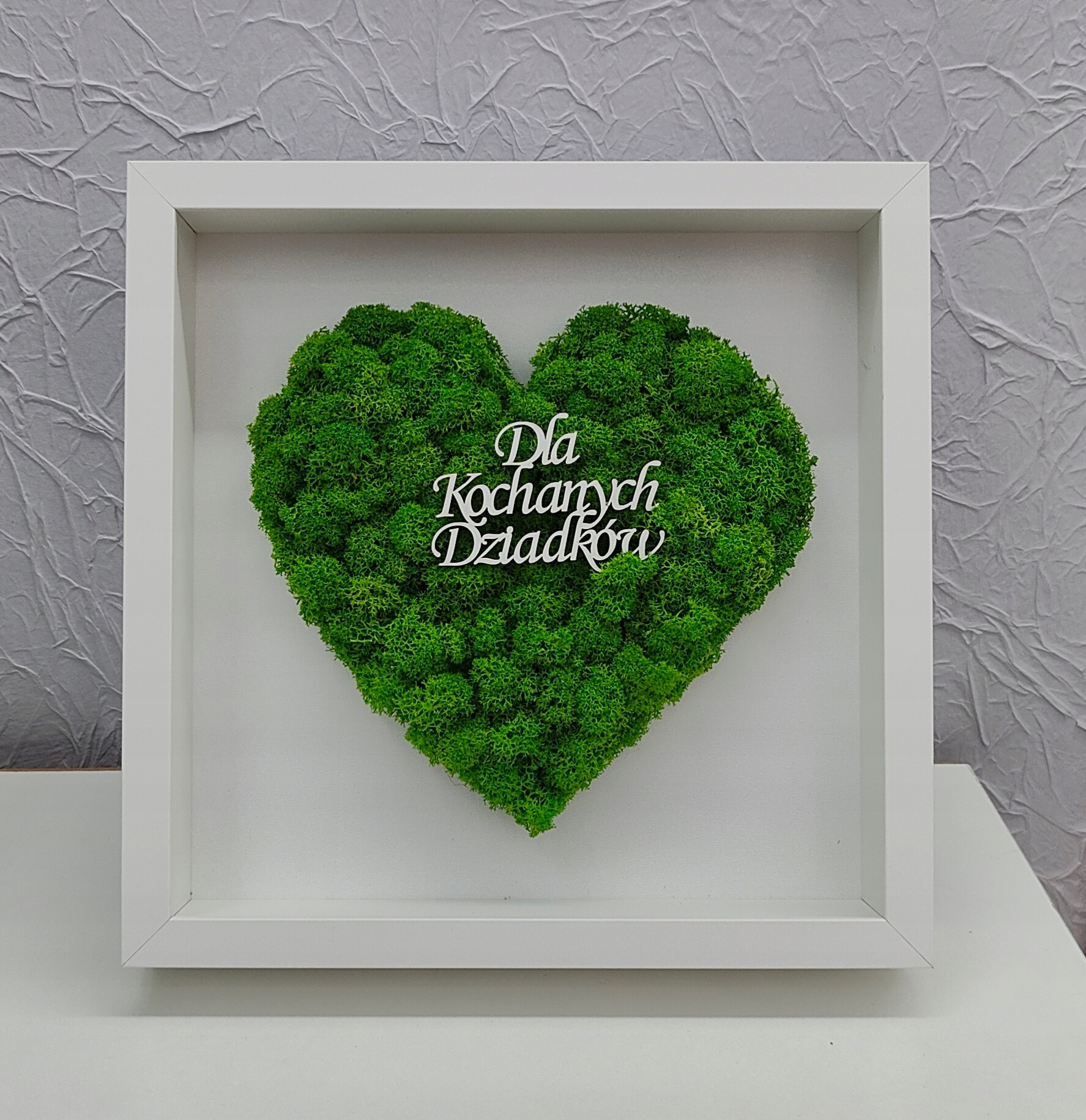Яскраве серце з фінського моху з вашим написом, розміщеним у білому кадрі, буде дивовижним подарунком з нагоди бабусі та дідуся . Написи виготовлені з подвійного білого HDF.