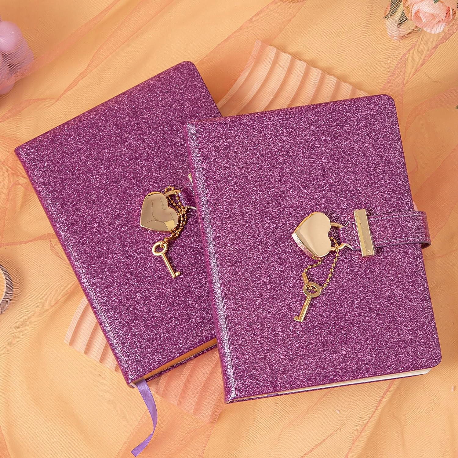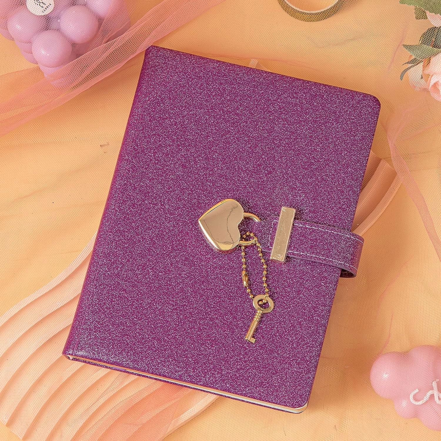 Блокнот Heart Lock із ключем, щоденник із блискучої фіолетової шкіряної шкіри B6 для запису, 144 аркуші розлінованого паперу, подарунок для дівчат, жінок
