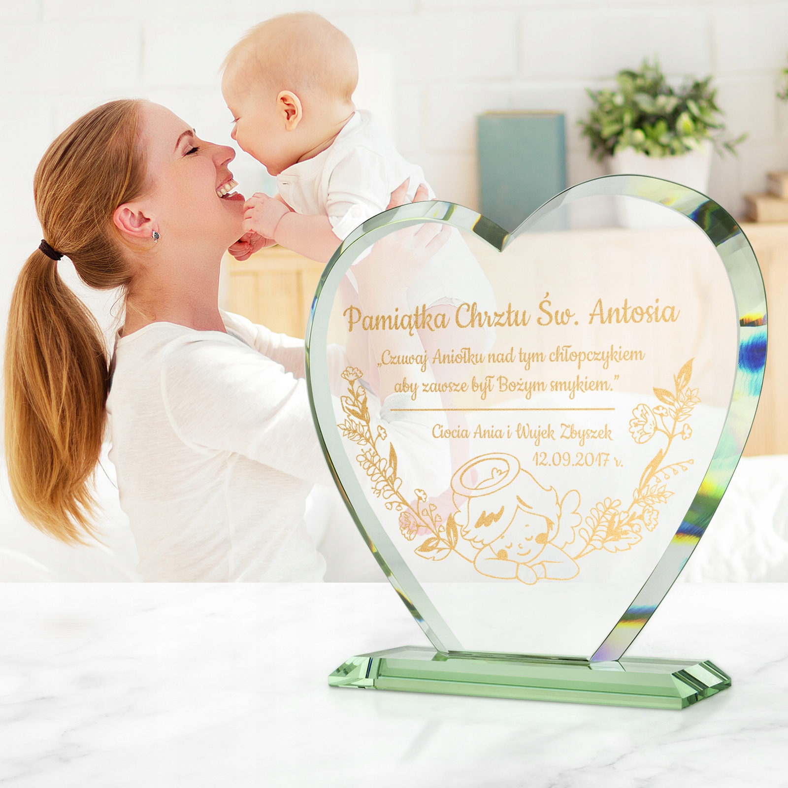 Чудовим сувеніром на свято Хрещення стане скляний трофей у формі серця з гравіюванням присвяти. Виріб виготовлено з міцного і товстого скла. Виконаємо на статуетці надзвичайно точне та точне лазерне гравіювання. Подарувавши такий подарунок на хрестини дитині, ви можете бути впевнені, що він буде довговічним і вічним. Скляна статуетка у формі серця з вигравіруваною присвятою завжди буде нагадувати вам про подаровану подію. Статуетка з гравіюванням постачається в елегантному темно-синьому футлярі, що робить її готовою до подарунка.