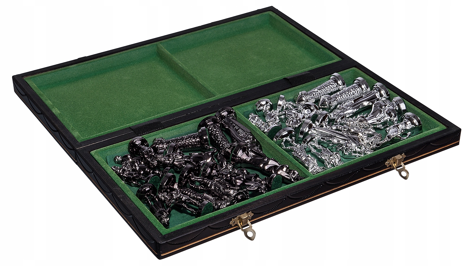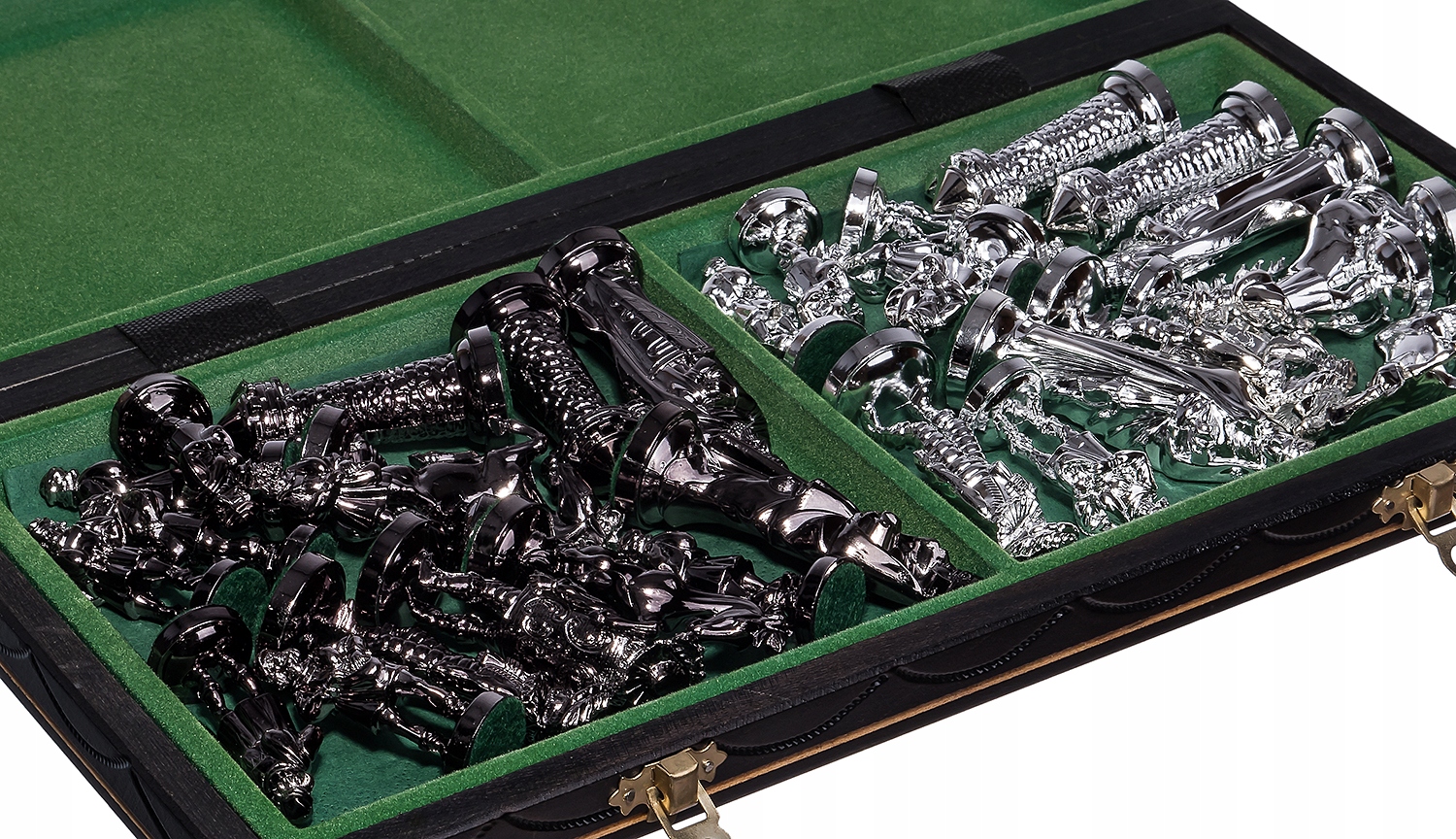 Шахові фігури виготовлені з пластику, покриті срібною та чорною металізованою фарбою.