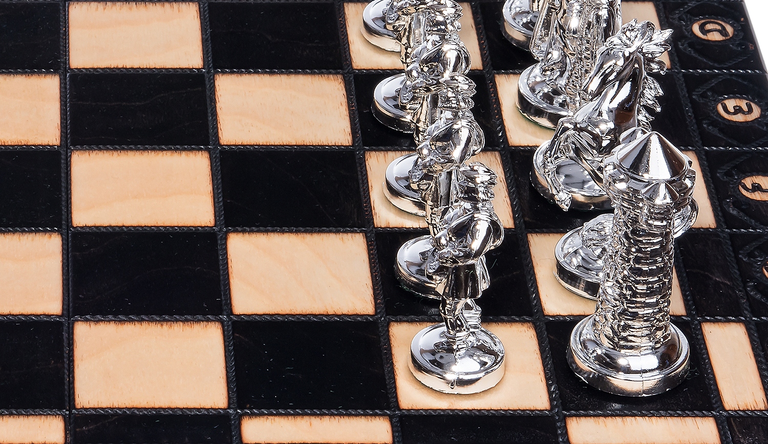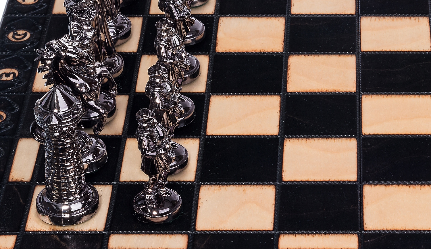 Квадрати шахівниці випалені на фанері. Подібним чином наносили літери та цифри з додатковим декоративним мотивом.